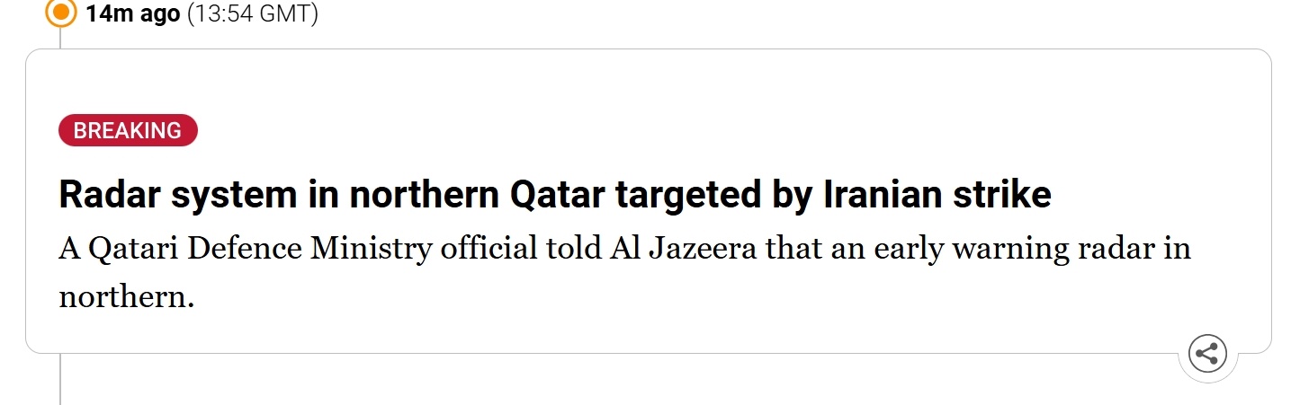 半岛电视台报道,卡塔尔国防部官员表示,卡塔尔北部的一个早期预警雷达遭到袭击。➤美