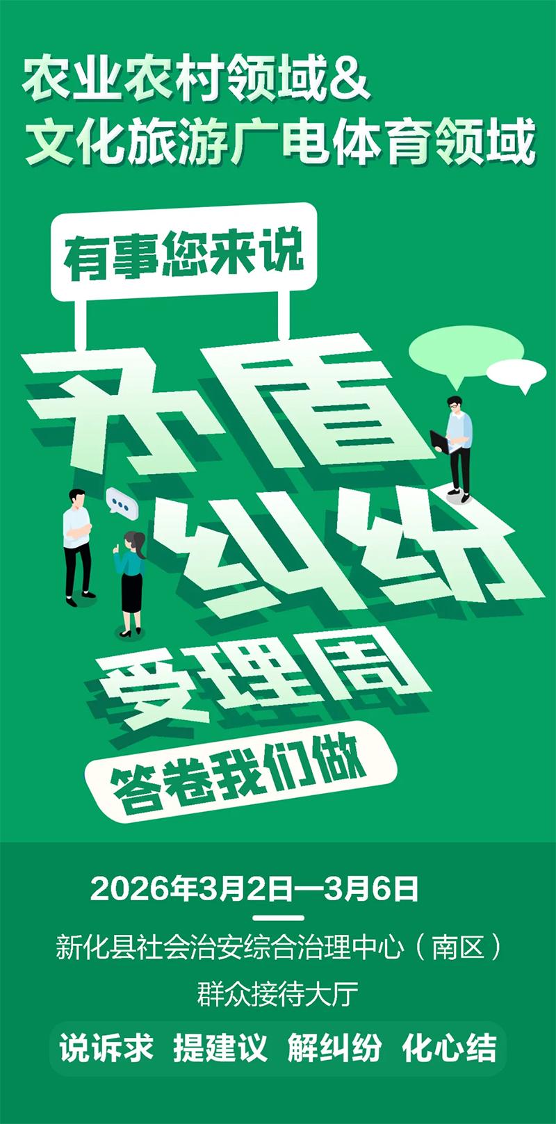 为创新推进综治中心规范化建设和实体化运行,方便群众反映诉求和政策咨询。根据新化县社会治安综合治理中心建立职能部门矛盾纠纷受理周制度,2026年3月2日—3月6日,由县农业农村局、县文化旅游广电体育局受理本行业本领域矛盾纠纷和其他诉求事项。届时,欢迎广大群众来新化县社会治安综合治理中心(南区)群众接待大厅反映相关矛盾纠纷诉求、意见、建议和需要解决的问题。
