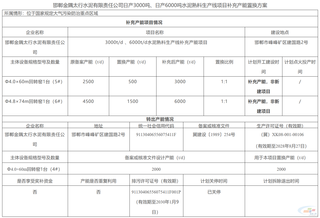 置换方案显示,邯郸金隅太行水泥(5#)2500t/d熟料生产线补充产能500t/d,补齐后产能3000t/d,(6#)4500t/d熟料生产线补充产能1500t/d,补齐后产能6000t/d,退出产能来自同厂区(4#)2000t/d熟料生产线,置换比例1:1。