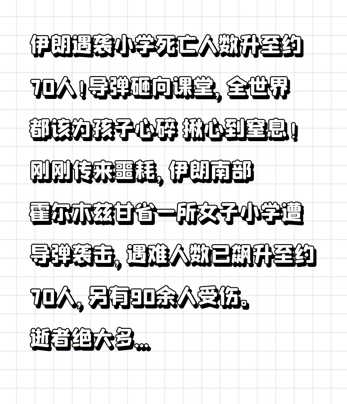 伊朗遇袭小学死亡人数升至约70人!导弹砸向课堂,全世界都该为孩子心碎 揪心到窒息!刚刚传来噩耗,伊朗南部霍尔木兹甘省一所女子小学遭导弹袭击,遇难人数已飙升至约70人,另有90余人受伤。逝者绝大多数是7—12岁的小女孩,还有守护她们的老师与校工。朗朗读书声戛然而止,校园变成人间炼狱,每一个数字,都在刺痛全世界的心。 事发时,近170名孩子正在教室上课,阳光、课本、小书包,本该是最安心的童年日常。一枚导弹呼啸而至,教学楼瞬间坍塌,瓦砾遍地、浓烟滚滚。现场散落着带血的文具、破碎的作业本、小小的鞋子,家长们疯了一样扒着废墟哭喊,一声声“我的孩子”,听得人瞬间破防。 从5人、24人、40人,再到如今约70人,伤亡数字每跳动一次,都是一个家庭的彻底破碎。医院挤满重伤的孩子,医护人员拼尽全力抢救,可越来越多幼小的生命,永远停在了这一天。 转折点来了!这场悲剧本可以避免,却成了战争最残忍的牺牲品。 美以联合军事行动席卷伊朗,精准打击本该对准军事目标,可导弹却偏偏落在了毫无抵抗力的校园。孩子们不懂政治、不涉争端,她们只是想好好读书、平安长大,却成了大国博弈的无辜代价。所谓“精准打击”,变成了对平民、对儿童的无差别伤害,彻底突破人类道德与国际法的底线。 伊朗宣布全国学校无限期停课,无数孩子活在警报与恐惧里。战争机器轰鸣,最脆弱的永远是孩子;战火蔓延,最让人心碎的永远是失去童年的生命。 我们一遍遍地问:这个世界怎么了?航母可以横行、导弹可以呼啸,但为什么要对准手无寸铁的孩子?强权可以争输赢,战争可以分胜负,但孩子不该成为筹码,校园不该变成战场。 没有谁天生该活在硝烟里,没有孩子该为成年人的冲突买单。70条小生命,不是冰冷的数字,是70个破碎的家庭,是70个被掐断的未来。 愿天堂没有炮火,愿逝者安息、生者坚强。更愿全世界听见这哭声:停止战争,放过孩子! 孩子不该活在警报里,校园不该被战火笼罩,和平才是给童年最好的礼物。 如果你也心疼这些孩子,评论区留下一句“愿平安”,让更多人看见战争的残酷,守护每一个无辜的小生命。