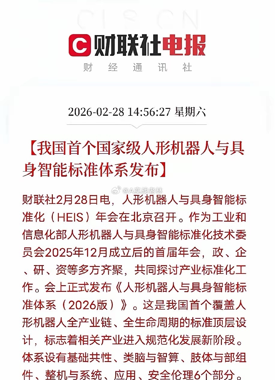 天奇股份: 人形机器人&具身智能标准发布国家首个人形机器人和具身智能标准发布啦这有利于行业的规范、健康、快速发展此利好发布,恰逢天奇二十日线处对于货真价实的具身机器人票天奇来说,无疑是长期利好下周,朱丽是利用此利好反转❓还是抛锅❓