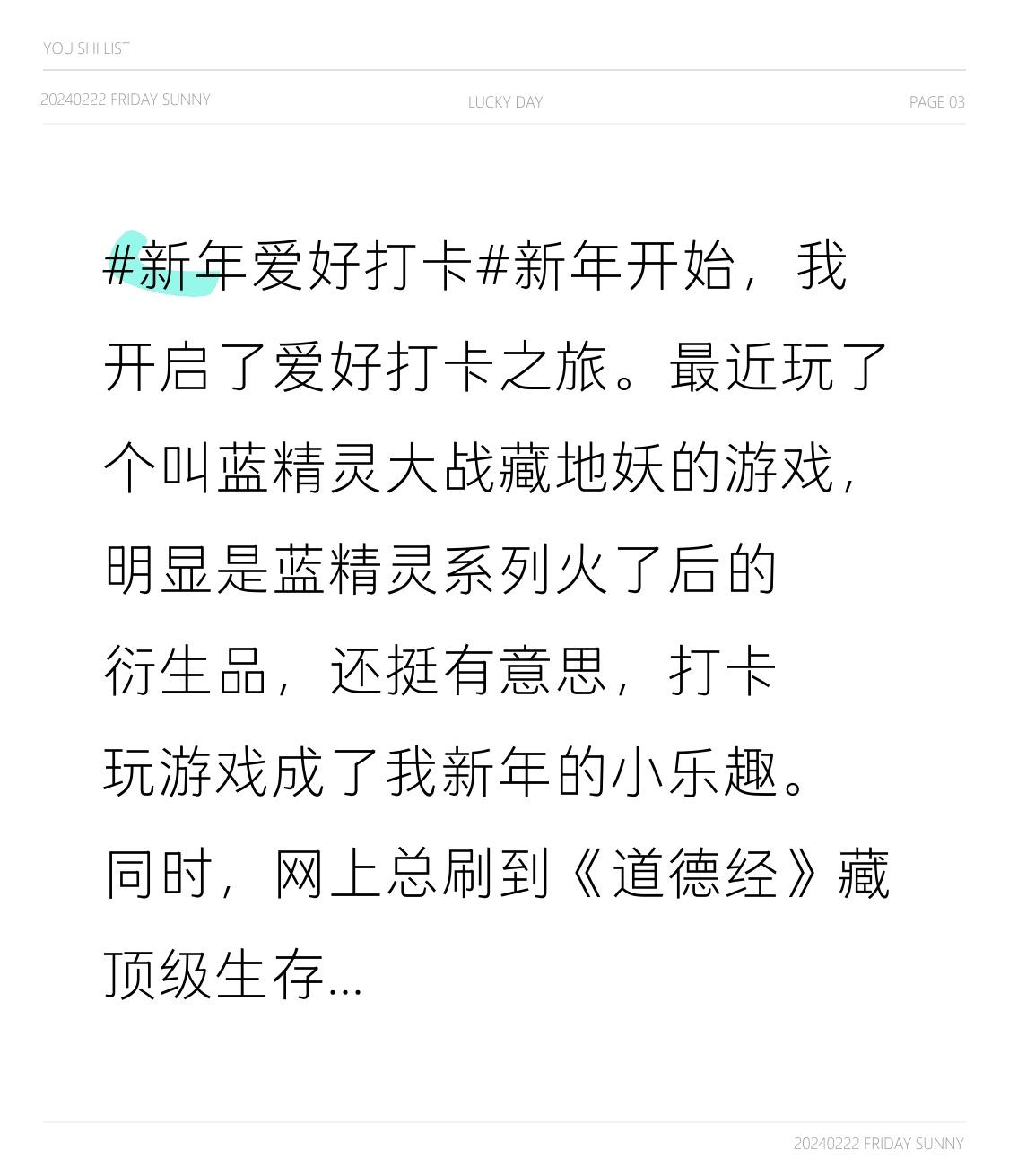 同时,网上总刷到《道德经》藏顶级生存法则的梗。像别在情绪差时做决定,睡一觉天会亮;收起攻击性,强者往往谦卑;看淡眼前损益,失败或许是避祸。这让我觉得新年打卡爱好之余,也该多悟悟这些道理,新的一年活得久又稳才是王道。