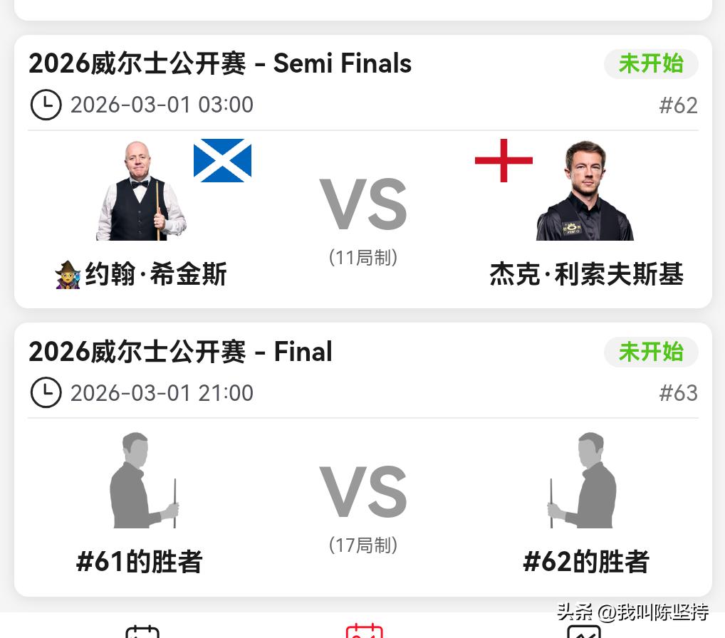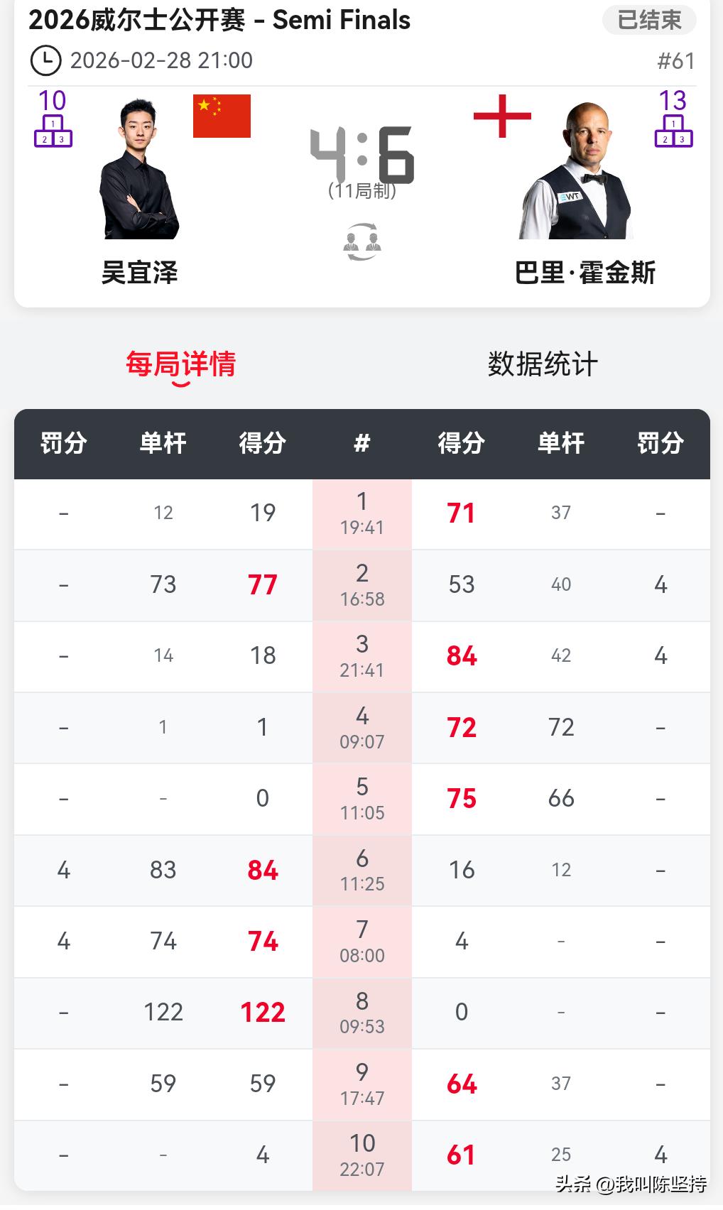 吴宜泽4-6不敌霍金斯,无缘威尔士公开赛决赛。 霍金斯状态不错,吴宜泽依然慢热,开局1-4落后,也非常危险。 随后吴宜泽打出精彩进攻,各种难度球不在话下,把比分追成4-4平手。 可惜在第九局,吴宜泽精彩长台上手,拿下59分,即将超分之际,一颗简单黑球没进,葬送胜利。 最后一局,霍金斯拼的更加凶猛,长台也非常凌厉,最终战胜了吴宜泽。 吴宜泽赛前采访说自己容易粗心大意,看起来依然没有改进,还需要努力。 凌晨3点,希金斯对阵利索夫斯基。