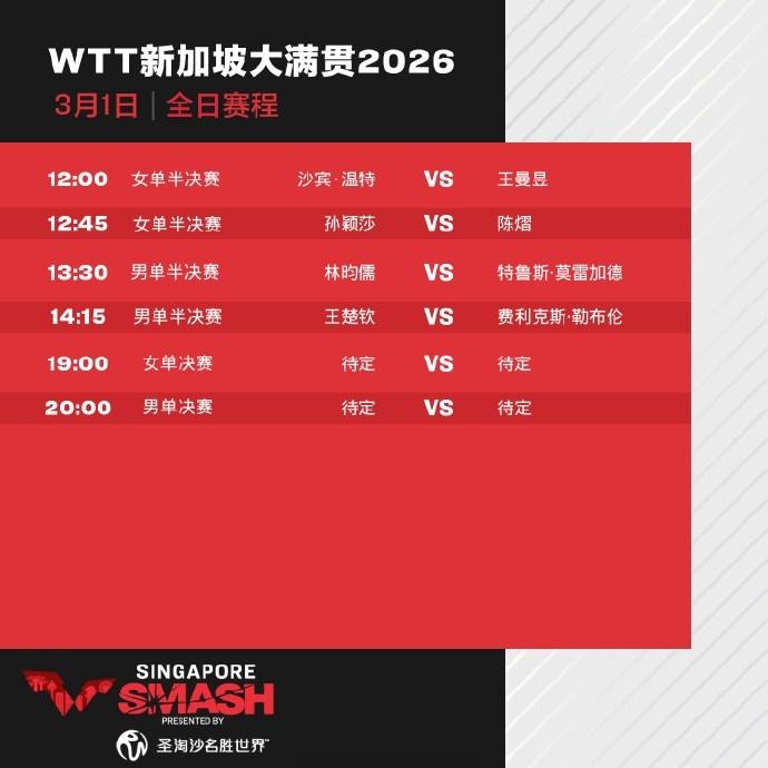 直播吧3月1日讯WTT新加坡大满贯3月1日赛程出炉,以下是具体对阵。