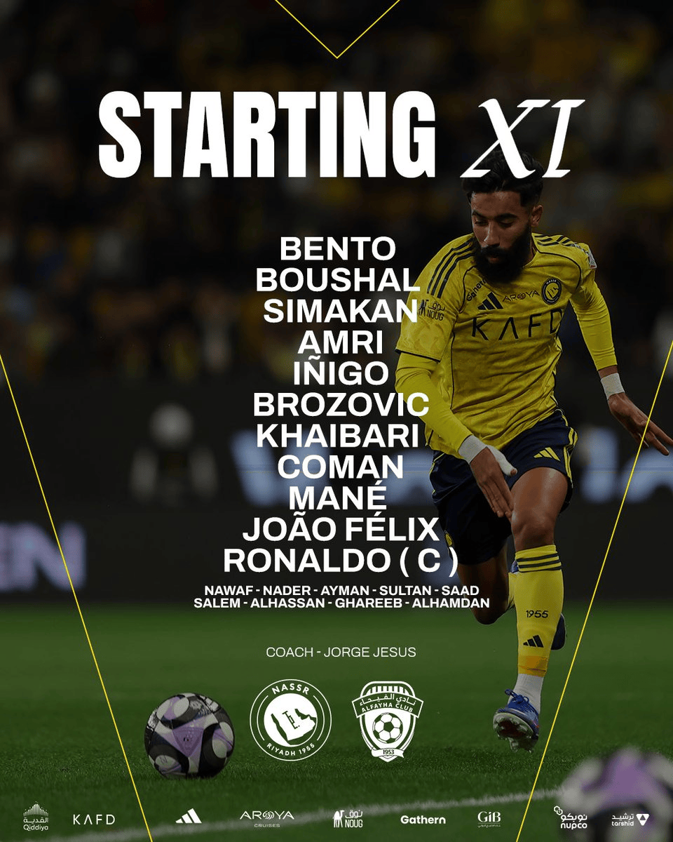 利雅得胜利首发:24-本托、12-纳瓦夫、3-西马坎、5-阿姆里、26-伊尼戈-马丁内斯、11-布罗佐维奇、17-哈巴利、21-科曼、10-马内、79-菲利克斯、7-C罗