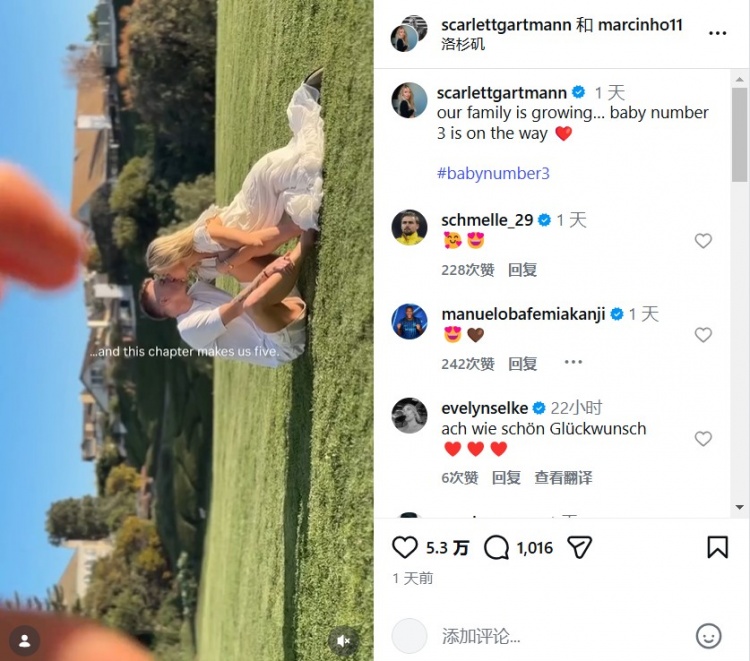 罗伊斯发布的一段视频中,他和妻子斯嘉丽甜蜜拥抱,两个女儿则在草地上嬉戏。他写道:我们的家庭正在壮大,第三个宝宝即将到来。
