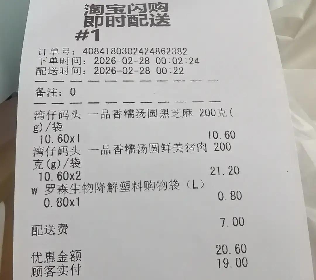 真没想到,这三大袋沉甸甸的汤圆,最后结账居然只花了一分钱。 眼看元宵节就晃到跟前了,我昨晚临睡前才猛地拍大腿,光顾着忙,把买汤圆这事忘得死死的。 队友在那边划拉手机,冷不丁冒出一句,说他那个外卖软件里躺着张二十五块的大额券。 我当时还挺纳闷,怎么偏偏他有我没有,结果是因为他之前分享链接拉了人头。 他盯着屏幕挑挑拣拣,选了湾仔码头的,两袋鲜肉馅配一袋黑芝麻。 我看他下单,心里还犯嘀咕,这都半夜十二点了,楼下超市早该关门了吧? 没成想人家那是二十四小时营业。 下单不到二十分钟,门口就传来了动静。 我起身去开门,一股子深夜的凉气直往脖子里钻,冻得我缩了缩肩膀。 外卖小哥刚好把袋子挂稳,正转身准备下楼,背影看着真挺辛苦。 我赶紧对着楼道喊了声谢谢,声音在空荡荡的走廊里还有点回响。 拎着袋子回屋,我闻着那塑料袋上的清冷味,心跳都快了点。 从小我就馋那股浓郁的黑芝麻劲儿,总觉得没这一口就不算过节。 儿子反倒爱吃肉的,总说那个味道鲜。 我刚才差点就想直接烧水煮几个,最后还是忍住了。 把汤圆塞进冰箱冷冻层,我心满意足地抹抹嘴,转身去厨房把水杯刷了。