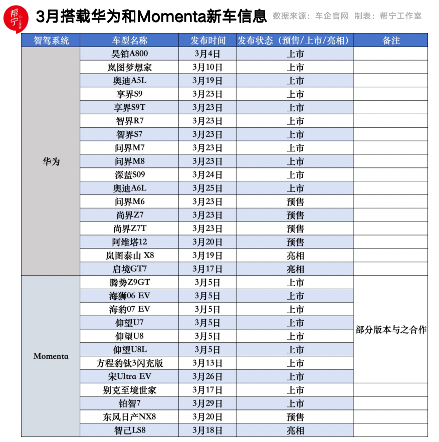 比如,在3月初第二代刀片电池暨闪充技术发布会上,比亚迪推出多款新车型,部分搭载的智驾系统与Momenta有合作关系。而华为则在3月23日春季全场景新品发布会上,亮相或上市近10款华为智驾系统车型。