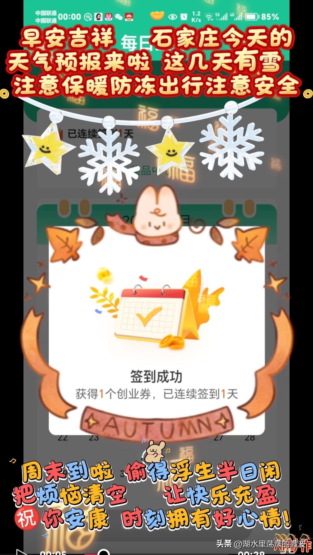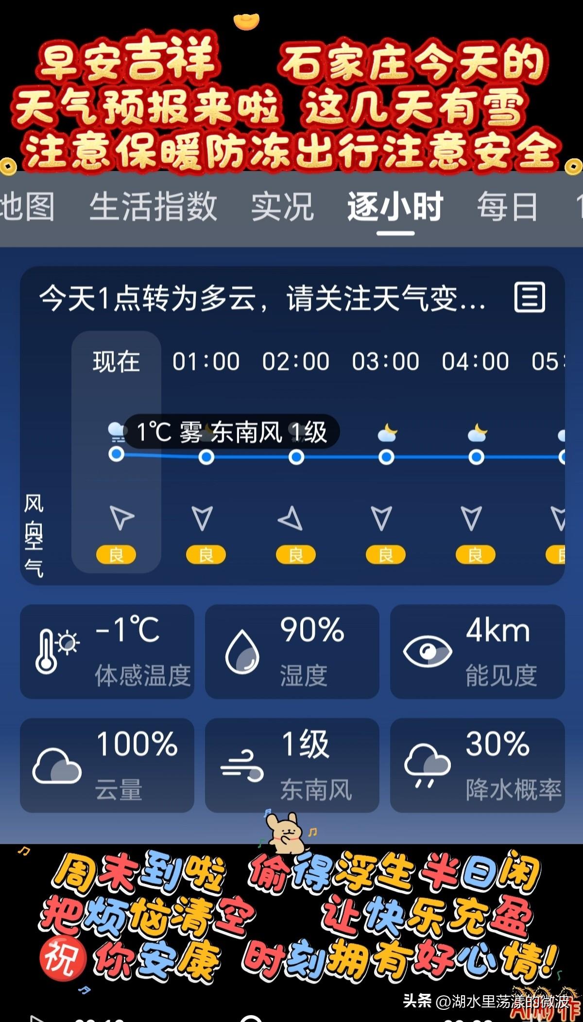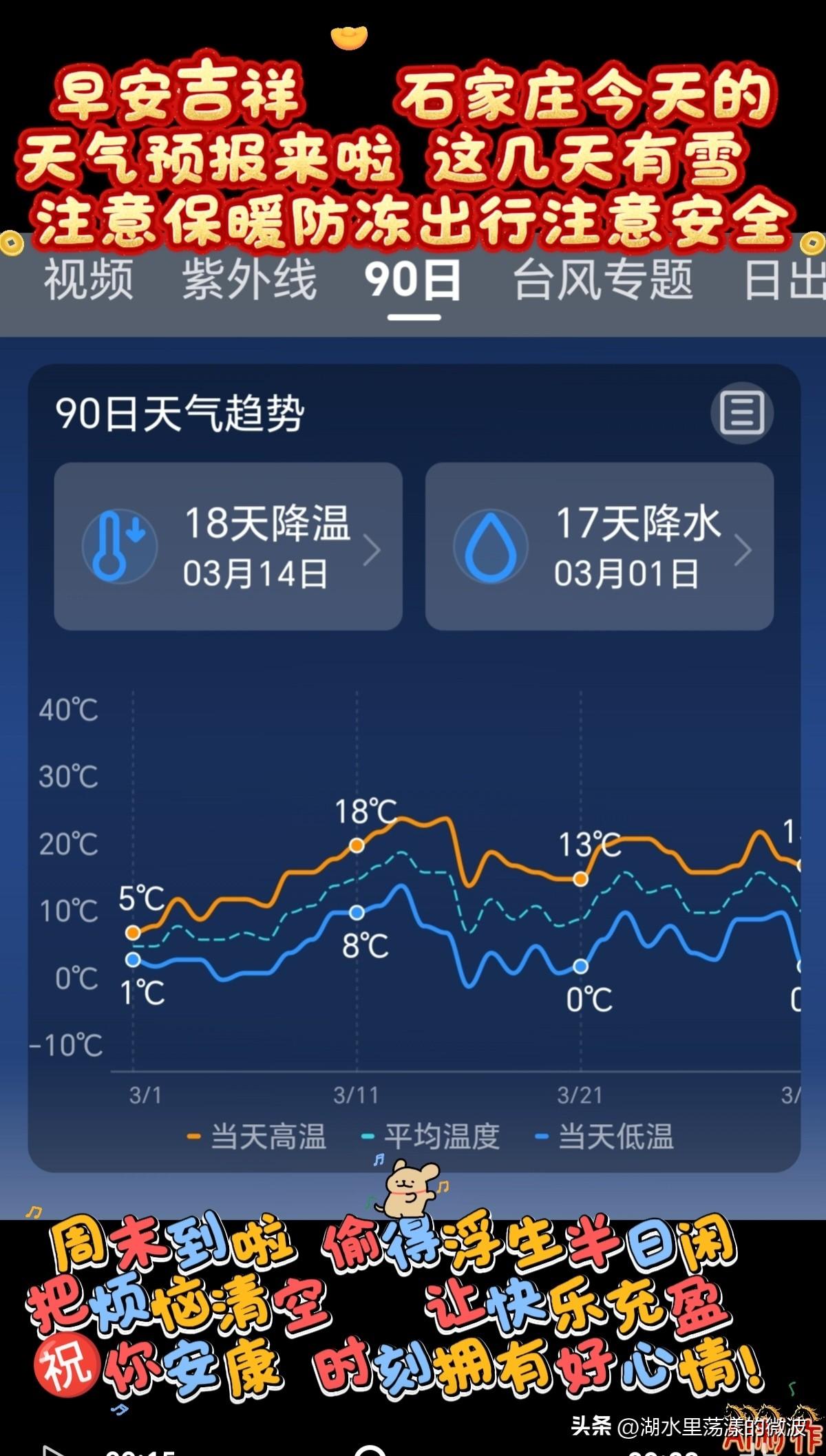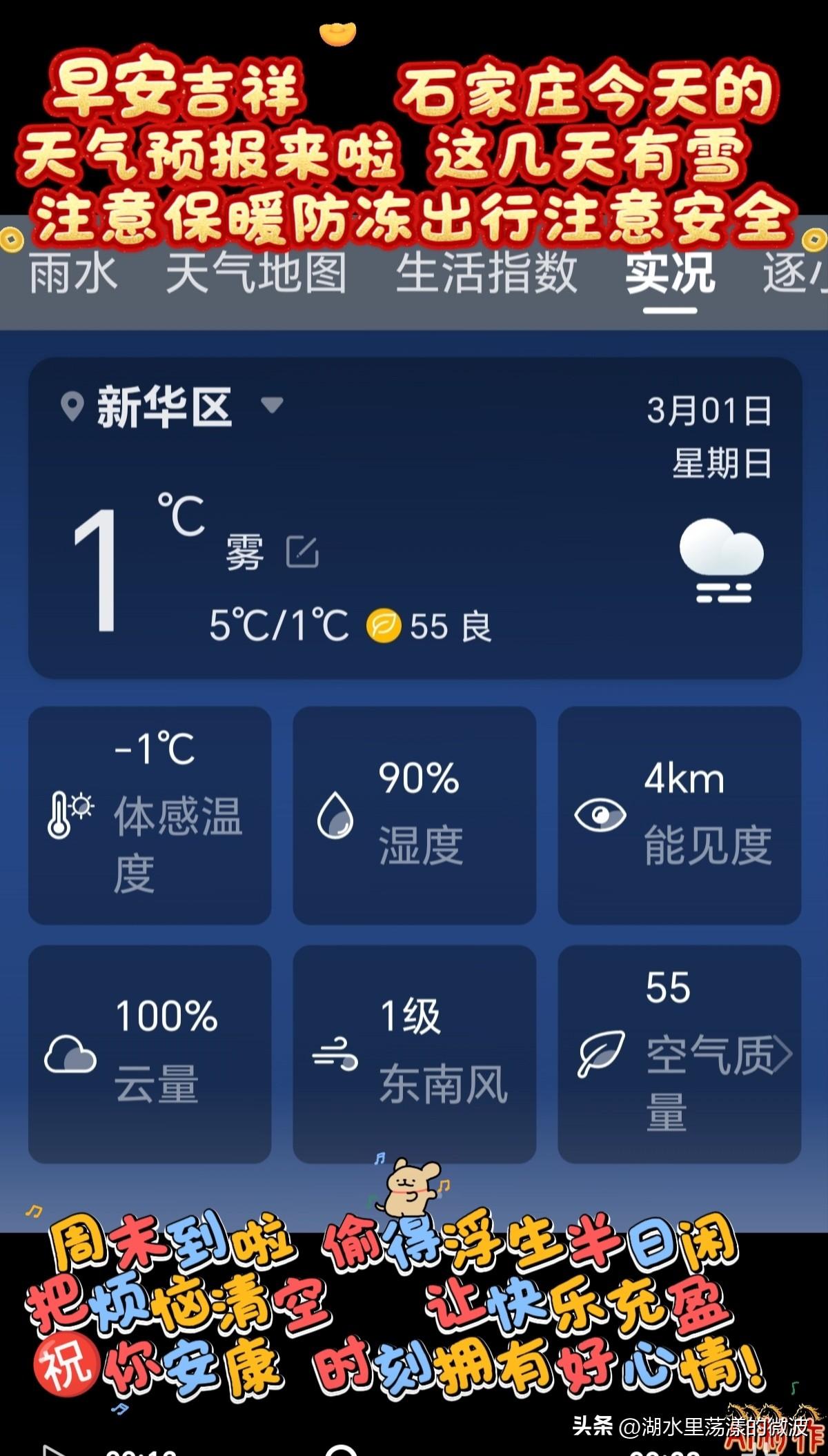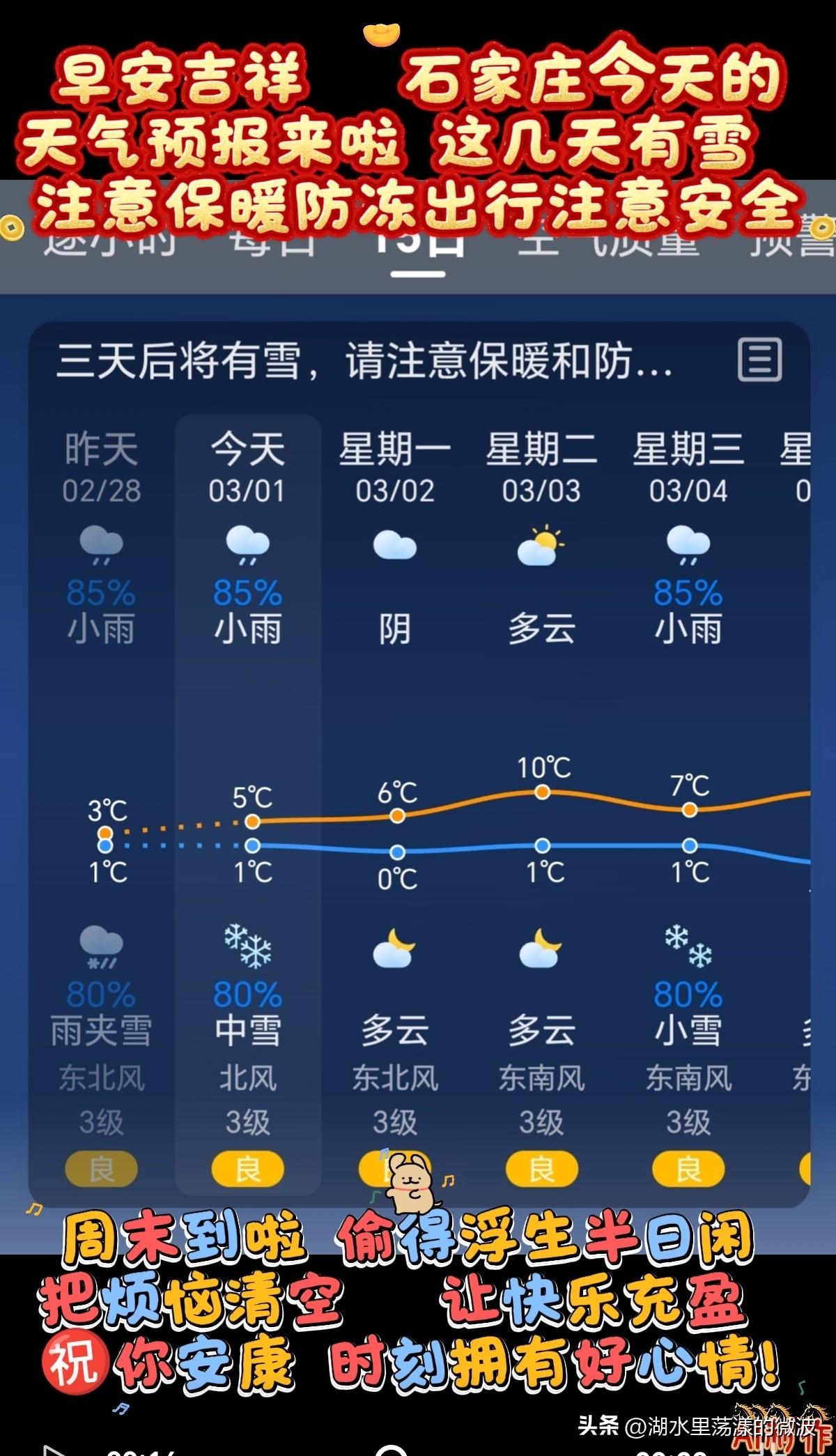 🌻早安问候🌻 𝙂𝙤𝙤𝙙 𝙈𝙤𝙧𝙣𝙞𝙣𝙜 今天是: 2026年3月1日 星期日 农历:丙午年正月十三 周末到啦,把烦恼清空,让快乐充盈,祝你时刻拥有好心情! 这几天有雪,注意保暖防冻防滑,出行注意安全 签到成功,获得1个创业卷,已连续签到1天 👉石家庄今日天气: 小雨转中雪,三天后有雪,气温下降,注意保暖防冻 👉空气质量:良 出门记得戴口罩,除少数对某些污染物特别容易过敏的人群外,其他人群可以正常进行室外活动空气质量 👉气温:5℃~1℃ 今天昼夜温差4度,气温下降,人体感觉寒冷,不舒适,请注意防寒保暖 👉湿度:81% 👉风向:北风 👉风力:3级 👉紫外线:1级,最弱紫外线辐射天气,无需特别防护。若长期在户外,建议涂擦SPF在8-12之间的防晒护肤品 👉日出:06:54 👉日落:18:15 ꧁ 🍄꧂ 🌷🌴🍒 愿周末的每一缕风,都吹走你的疲惫,带来满溢的欢喜。 ʚ🌻ɞ早安吉祥☕️