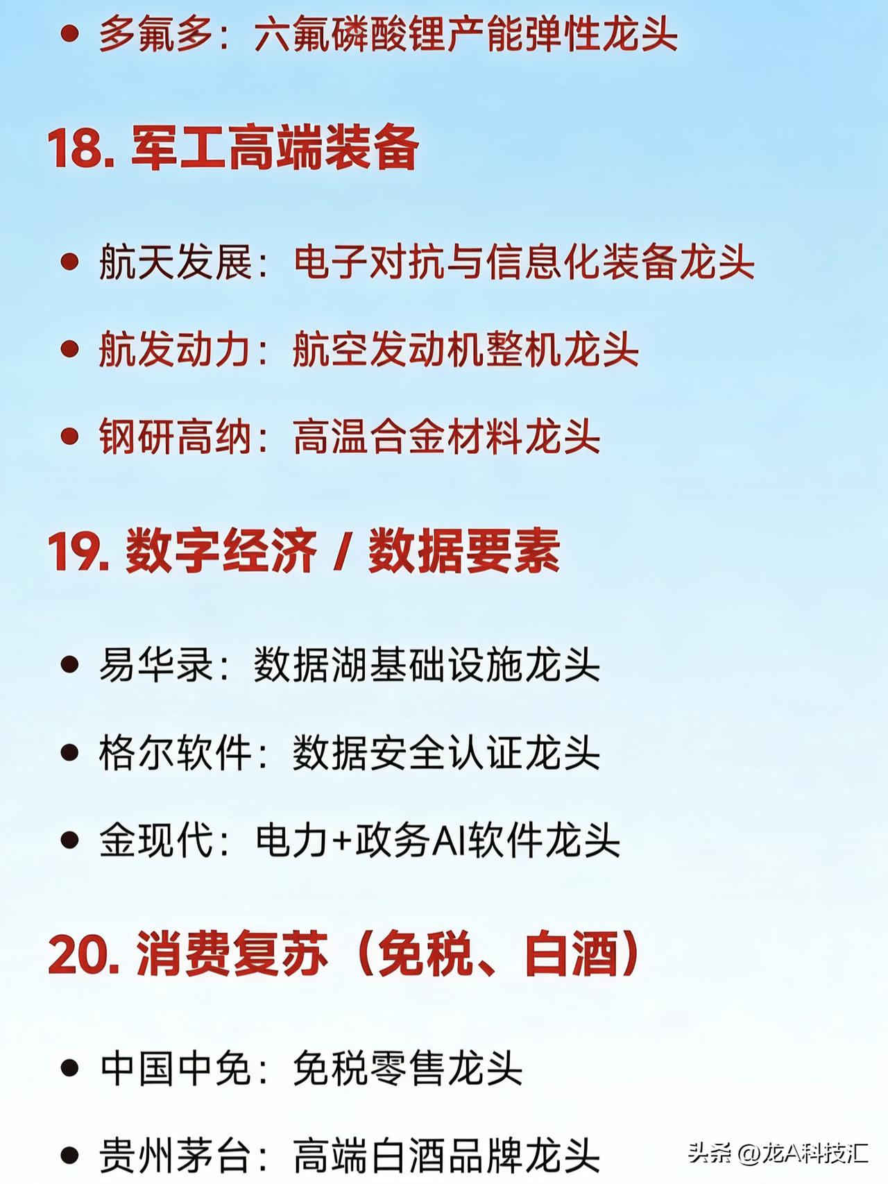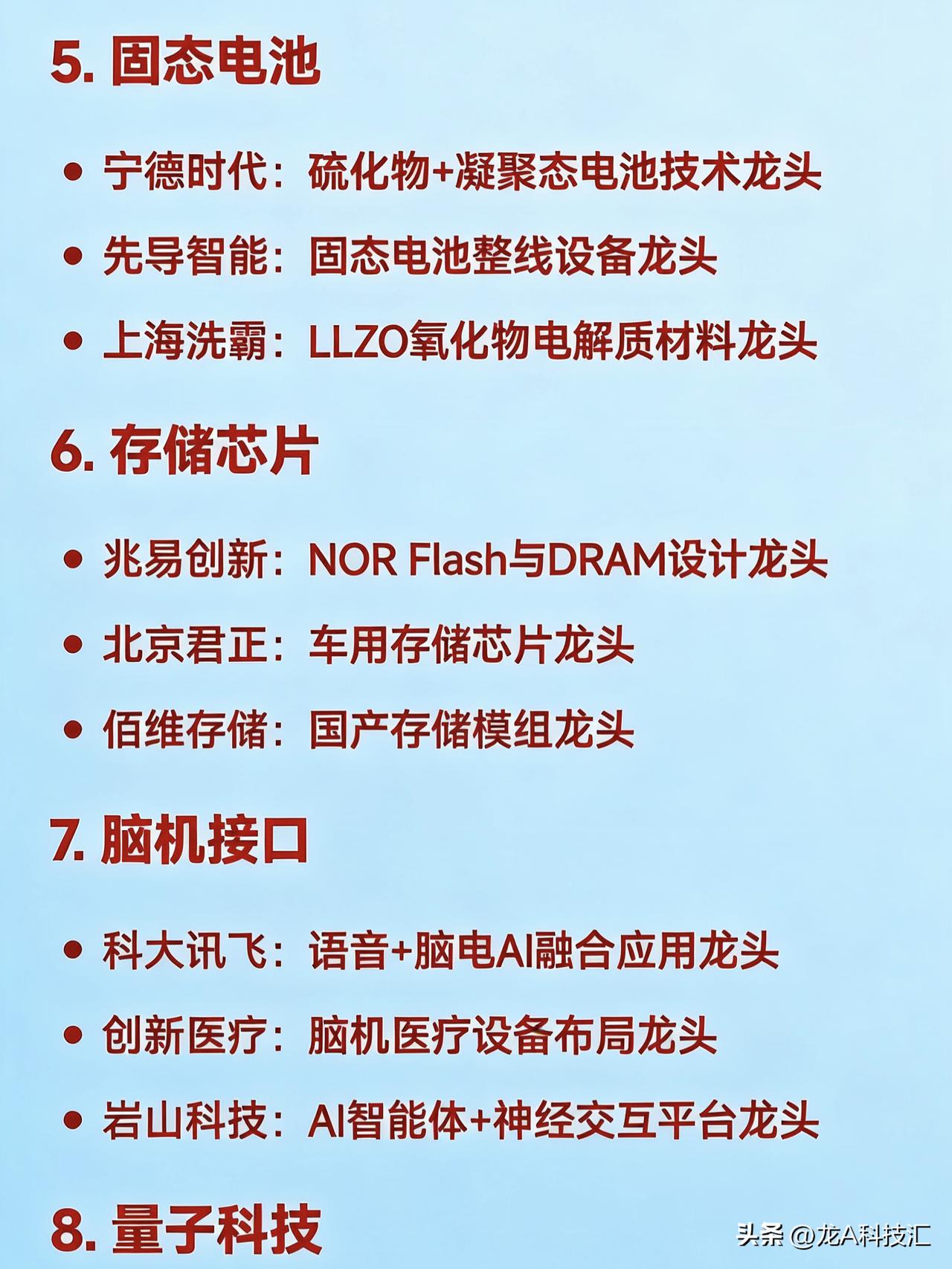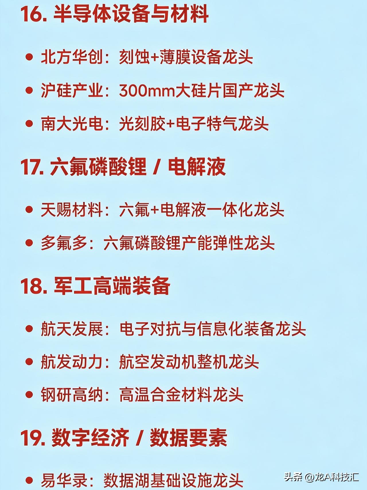 2026年2月(整月)二十大热点科技 1. AI算力基础设施 中际旭创:光模块全球龙头 润泽科技:智算中心运营龙头 工业富联:AI服务器代工龙头 天孚通信:CPO光器件核心龙头 2. 商业航天 航天电子:航天电子系统龙头 中国卫星:卫星制造与运营龙头 超捷股份:火箭结构件制造龙头 铂力特:金属3D打印用于火箭发动机龙头 3. 人形机器人 绿的谐波:谐波减速器国产龙头 兆威机电:微型传动与灵巧手龙头 汇川技术:伺服系统龙头 三花智控:机器人热管理与执行器龙头 4. 低空经济 / eVTOL 中信海直:低空运营服务龙头 万丰奥威:eVTOL整机制造潜力龙头 宗申动力:航空发动机配套龙头 光启技术:超材料隐身结构件龙头 5. 固态电池 宁德时代:硫化物+凝聚态电池技术龙头 先导智能:固态电池整线设备龙头 上海洗霸:LLZO氧化物电解质材料龙头 6. 存储芯片 兆易创新:NOR Flash与DRAM设计龙头 北京君正:车用存储芯片龙头 佰维存储:国产存储模组龙头 7. 脑机接口 科大讯飞:语音+脑电AI融合应用龙头 创新医疗:脑机医疗设备布局龙头 岩山科技:AI智能体+神经交互平台龙头 8. 量子科技 国盾量子:量子通信设备龙头 光迅科技:量子光源器件供应商龙头 9. 可控核聚变 永鼎股份:高温超导磁体材料龙头 合锻智能:聚变装置大型部件装备龙头 10. 无人驾驶 / 智能座舱 德赛西威:智能驾驶域控制器龙头 四维图新:高精地图与车规芯片龙头 拓普集团:智能底盘系统龙头 11. 光伏新技术(钙钛矿、BC电池) 钧达股份:TOPCon+钙钛矿双线龙头 协鑫集成:GTC叠层钙钛矿组件龙头 隆基绿能:BC电池技术全球龙头 12. 电力设备(特高压、抽水蓄能) 国电南瑞:电网自动化与调度系统龙头 东方电气:抽水蓄能+燃气轮机设备龙头 平高电气:特高压开关设备龙头 13. 小金属 / 战略资源 章源钨业:钨深加工龙头 云南锗业:红外+光伏锗材料龙头 湖南黄金:锑+黄金资源龙头 14. 液冷散热(AI服务器配套) 英维克:全链条液冷解决方案龙头 申菱环境:数据中心液冷系统龙头 高澜股份:液冷覆盖AI与新能源龙头 15. AI应用(营销、内容、办公) 蓝色光标:AIGC营销龙头 利欧股份:AI智能体+数字营销龙头 昆仑万维:AI大模型+内容生成龙头 16. 半导体设备与材料 北方华创:刻蚀+薄膜设备龙头 沪硅产业:300mm大硅片国产龙头 南大光电:光刻胶+电子特气龙头 17. 六氟磷酸锂 / 电解液 天赐材料:六氟+电解液一体化龙头 多氟多:六氟磷酸锂产能弹性龙头 18. 军工高端装备 航天发展:电子对抗与信息化装备龙头 航发动力:航空发动机整机龙头 钢研高纳:高温合金材料龙头 19. 数字经济 / 数据要素 易华录:数据湖基础设施龙头 格尔软件:数据安全认证龙头 金现代:电力+政务AI软件龙头 20. 消费复苏(免税、白酒) 中国中免:免税零售龙头 贵州茅台:高端白酒品牌龙头