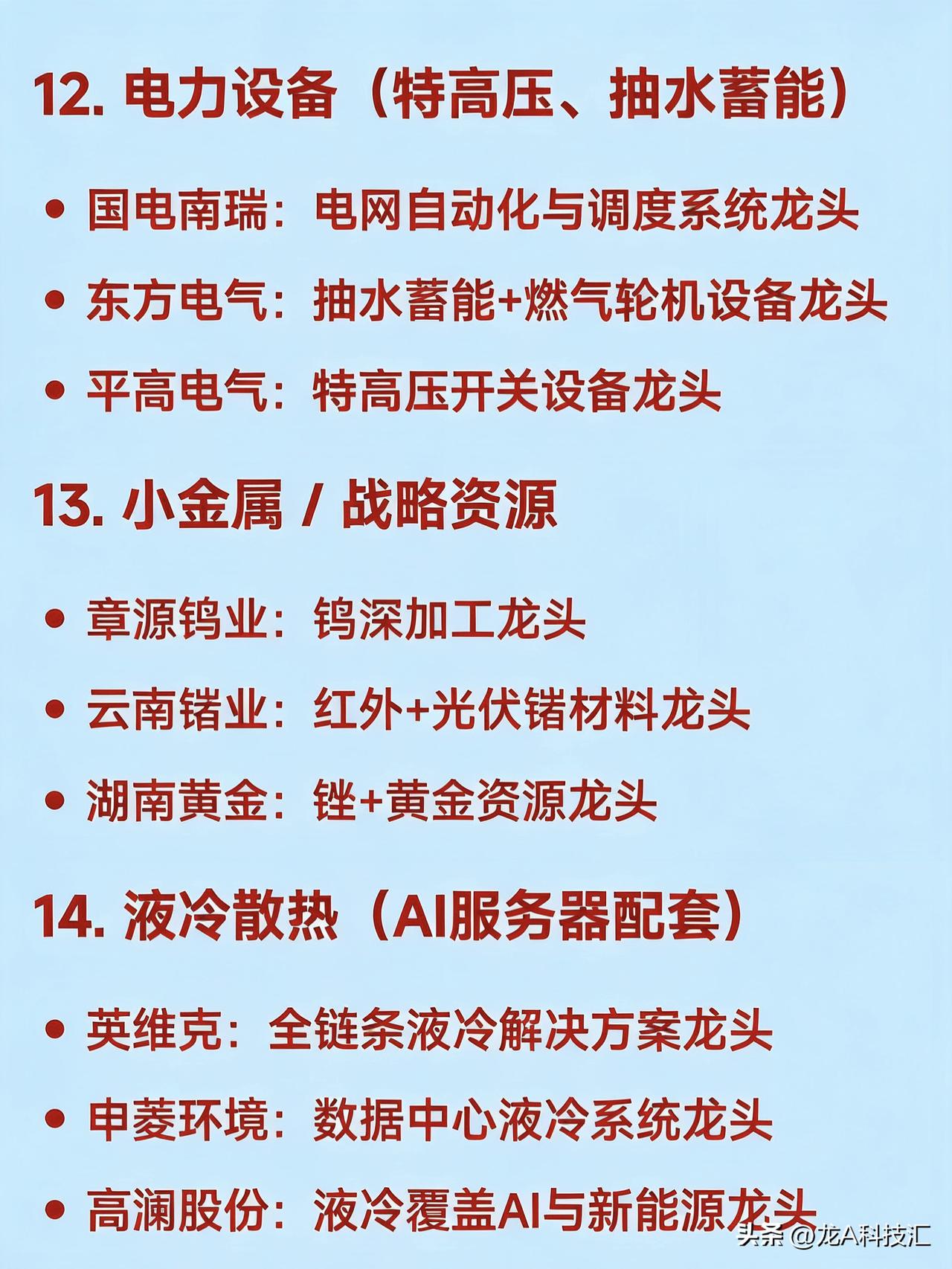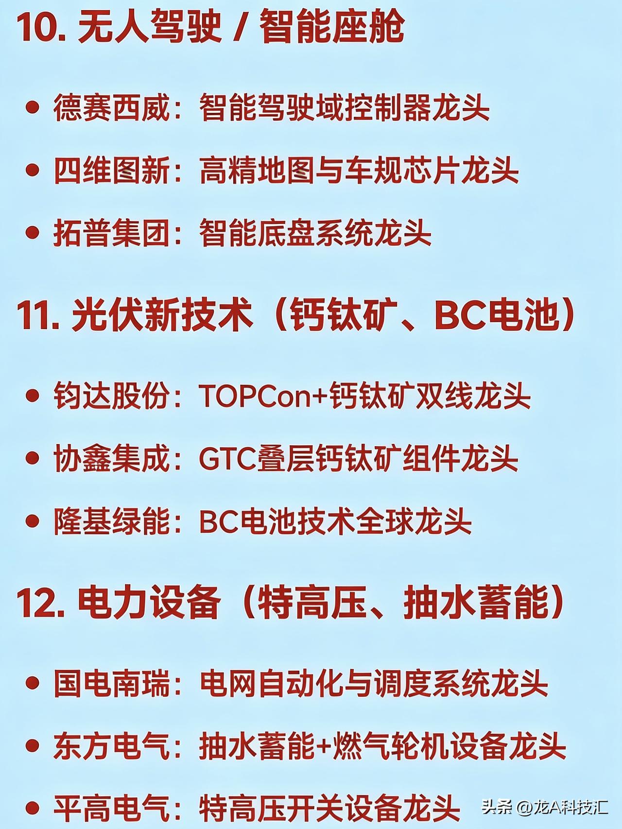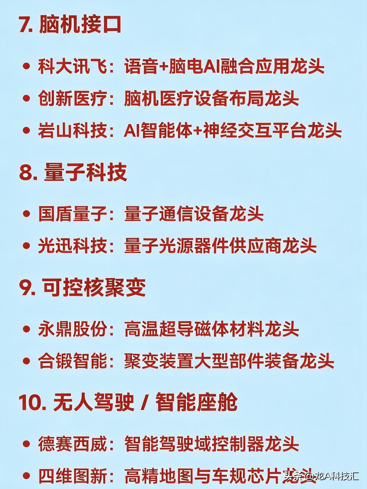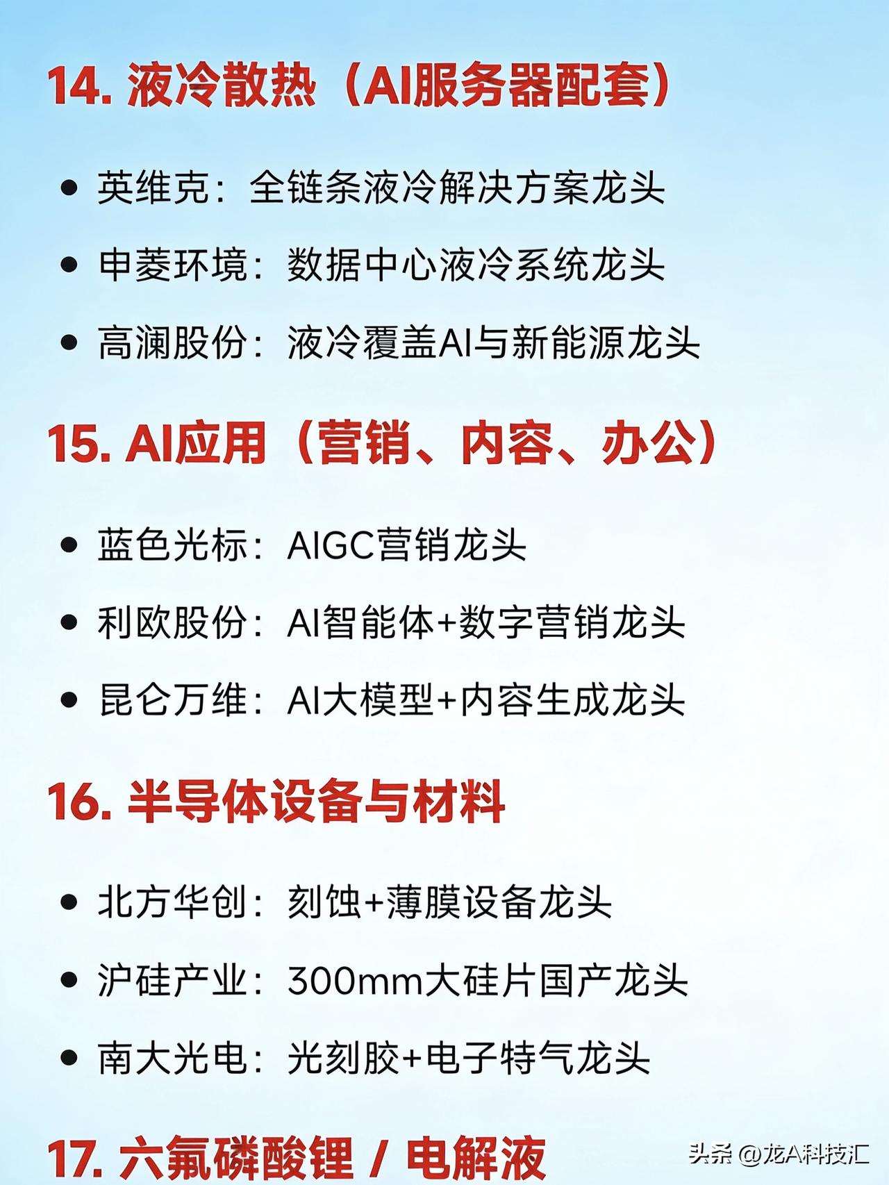 2026年2月(整月)二十大热点科技 1. AI算力基础设施 中际旭创:光模块全球龙头 润泽科技:智算中心运营龙头 工业富联:AI服务器代工龙头 天孚通信:CPO光器件核心龙头 2. 商业航天 航天电子:航天电子系统龙头 中国卫星:卫星制造与运营龙头 超捷股份:火箭结构件制造龙头 铂力特:金属3D打印用于火箭发动机龙头 3. 人形机器人 绿的谐波:谐波减速器国产龙头 兆威机电:微型传动与灵巧手龙头 汇川技术:伺服系统龙头 三花智控:机器人热管理与执行器龙头 4. 低空经济 / eVTOL 中信海直:低空运营服务龙头 万丰奥威:eVTOL整机制造潜力龙头 宗申动力:航空发动机配套龙头 光启技术:超材料隐身结构件龙头 5. 固态电池 宁德时代:硫化物+凝聚态电池技术龙头 先导智能:固态电池整线设备龙头 上海洗霸:LLZO氧化物电解质材料龙头 6. 存储芯片 兆易创新:NOR Flash与DRAM设计龙头 北京君正:车用存储芯片龙头 佰维存储:国产存储模组龙头 7. 脑机接口 科大讯飞:语音+脑电AI融合应用龙头 创新医疗:脑机医疗设备布局龙头 岩山科技:AI智能体+神经交互平台龙头 8. 量子科技 国盾量子:量子通信设备龙头 光迅科技:量子光源器件供应商龙头 9. 可控核聚变 永鼎股份:高温超导磁体材料龙头 合锻智能:聚变装置大型部件装备龙头 10. 无人驾驶 / 智能座舱 德赛西威:智能驾驶域控制器龙头 四维图新:高精地图与车规芯片龙头 拓普集团:智能底盘系统龙头 11. 光伏新技术(钙钛矿、BC电池) 钧达股份:TOPCon+钙钛矿双线龙头 协鑫集成:GTC叠层钙钛矿组件龙头 隆基绿能:BC电池技术全球龙头 12. 电力设备(特高压、抽水蓄能) 国电南瑞:电网自动化与调度系统龙头 东方电气:抽水蓄能+燃气轮机设备龙头 平高电气:特高压开关设备龙头 13. 小金属 / 战略资源 章源钨业:钨深加工龙头 云南锗业:红外+光伏锗材料龙头 湖南黄金:锑+黄金资源龙头 14. 液冷散热(AI服务器配套) 英维克:全链条液冷解决方案龙头 申菱环境:数据中心液冷系统龙头 高澜股份:液冷覆盖AI与新能源龙头 15. AI应用(营销、内容、办公) 蓝色光标:AIGC营销龙头 利欧股份:AI智能体+数字营销龙头 昆仑万维:AI大模型+内容生成龙头 16. 半导体设备与材料 北方华创:刻蚀+薄膜设备龙头 沪硅产业:300mm大硅片国产龙头 南大光电:光刻胶+电子特气龙头 17. 六氟磷酸锂 / 电解液 天赐材料:六氟+电解液一体化龙头 多氟多:六氟磷酸锂产能弹性龙头 18. 军工高端装备 航天发展:电子对抗与信息化装备龙头 航发动力:航空发动机整机龙头 钢研高纳:高温合金材料龙头 19. 数字经济 / 数据要素 易华录:数据湖基础设施龙头 格尔软件:数据安全认证龙头 金现代:电力+政务AI软件龙头 20. 消费复苏(免税、白酒) 中国中免:免税零售龙头 贵州茅台:高端白酒品牌龙头