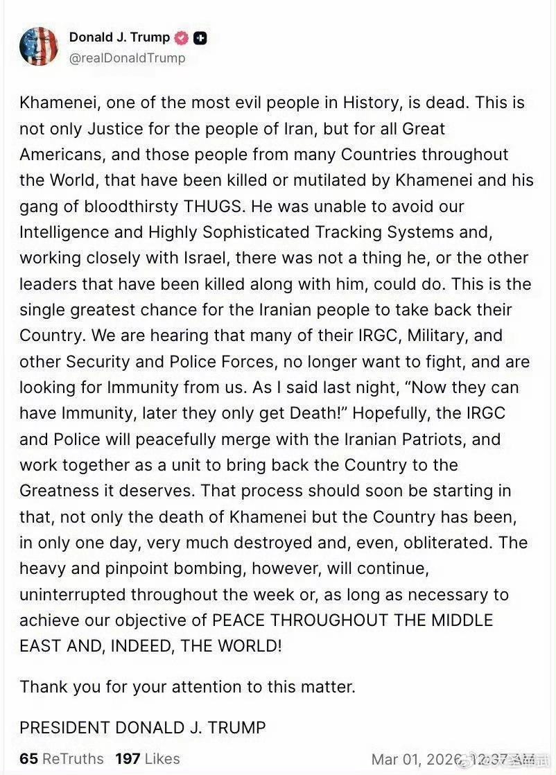 特朗普公然宣称哈梅内伊已经死了: “哈梅内伊,这个历史上最邪恶的人之一,已经死了。这不仅是为伊朗人民讨回公道,也是为所有伟大的美国人,以及世界上许多国家那些被他和他那帮嗜血暴徒杀害或致残的人伸张正义。 “他躲不过我们的情报网络和高度先进的追踪系统。我们与以色列密切合作,他本人,以及与他一同被击毙的其他领导人,根本无计可施。 “这是伊朗人民夺回自己国家的绝佳机会。我们听说,他们的伊斯兰革命卫队、军方以及其他安全和警察力量中,已有不少人不愿再战,并在寻求我们的豁免。正如我昨晚所说:“现在他们可以得到豁免,晚一点就只有死亡!” “希望伊斯兰革命卫队和警方能够与伊朗的爱国者和平融合,作为一个整体协力合作,让这个国家重回应有的伟大。这个进程应该很快就会启动。因为不仅哈梅内伊已经身亡,这个国家在短短一天之内也遭受了严重破坏,甚至几乎被摧毁。 “不过,大规模而精准的轰炸将持续进行,整个星期都不会中断,或者说,只要有必要,就会一直进行下去,直到我们实现让中东乃至全世界实现和平的目标。 谢关。”