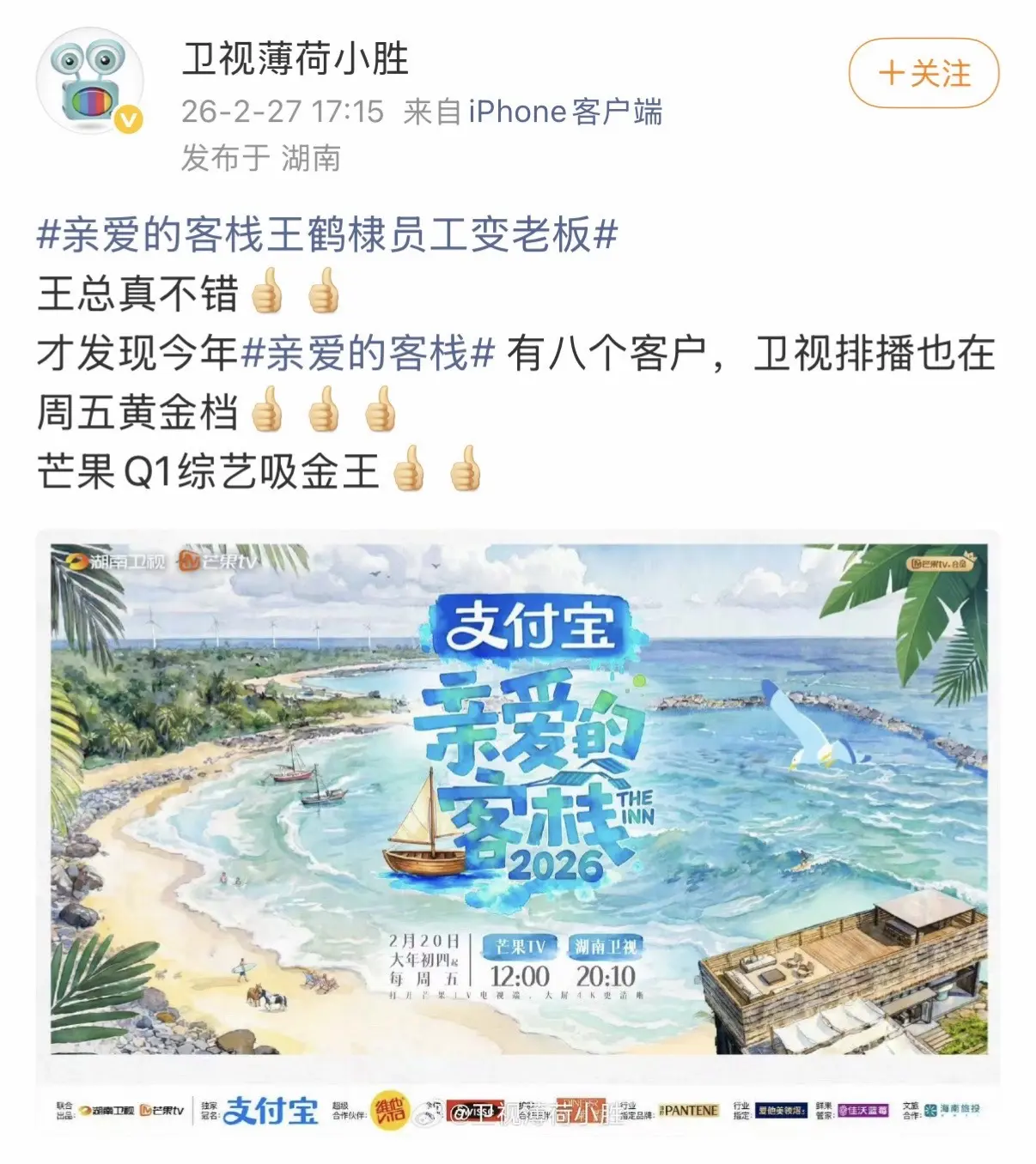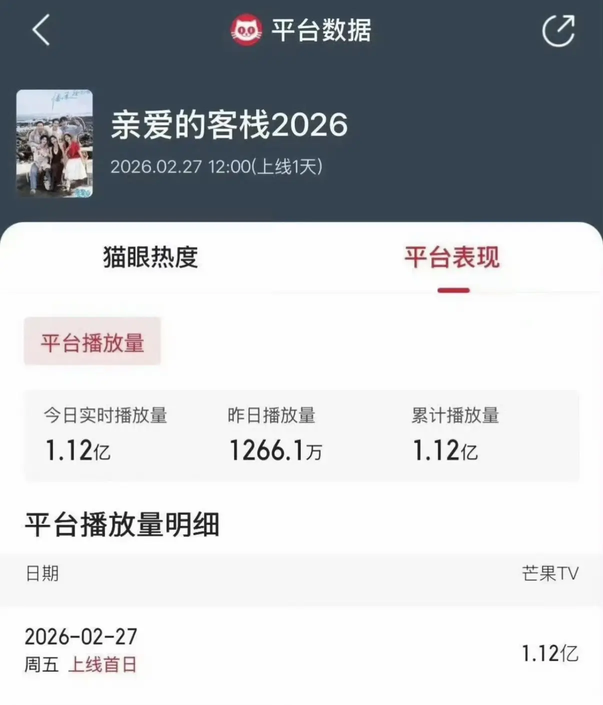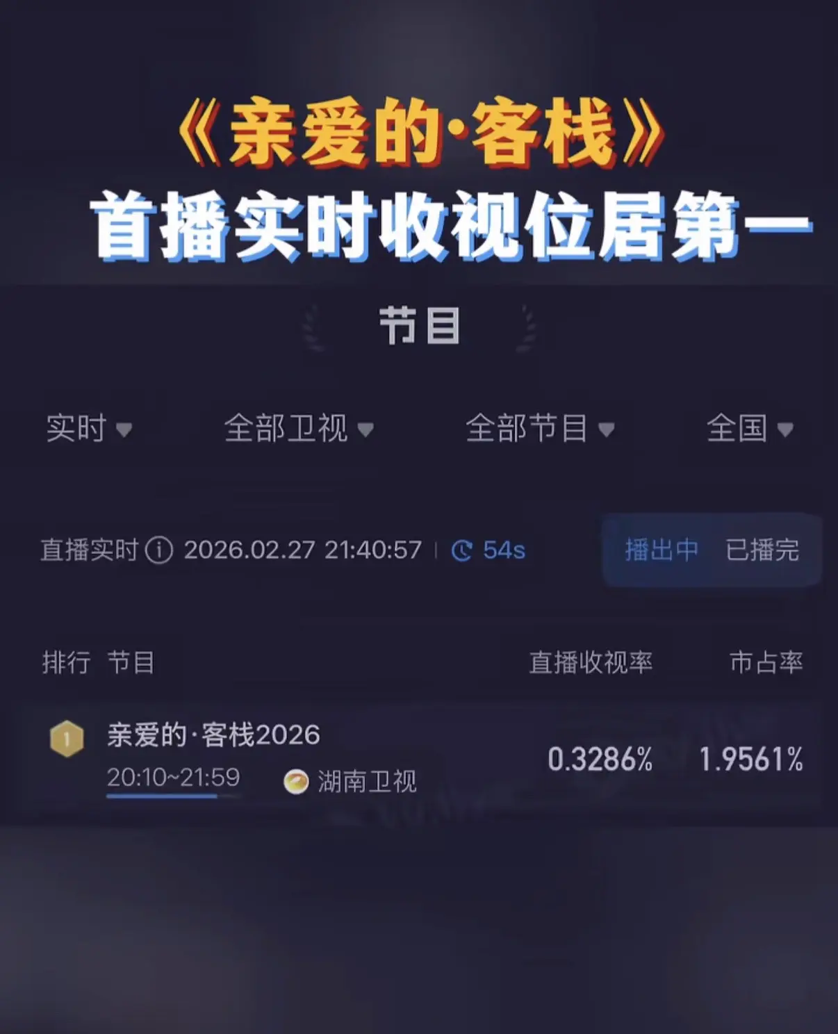 亲爱的客栈2026首日播出破亿收视率第一!!