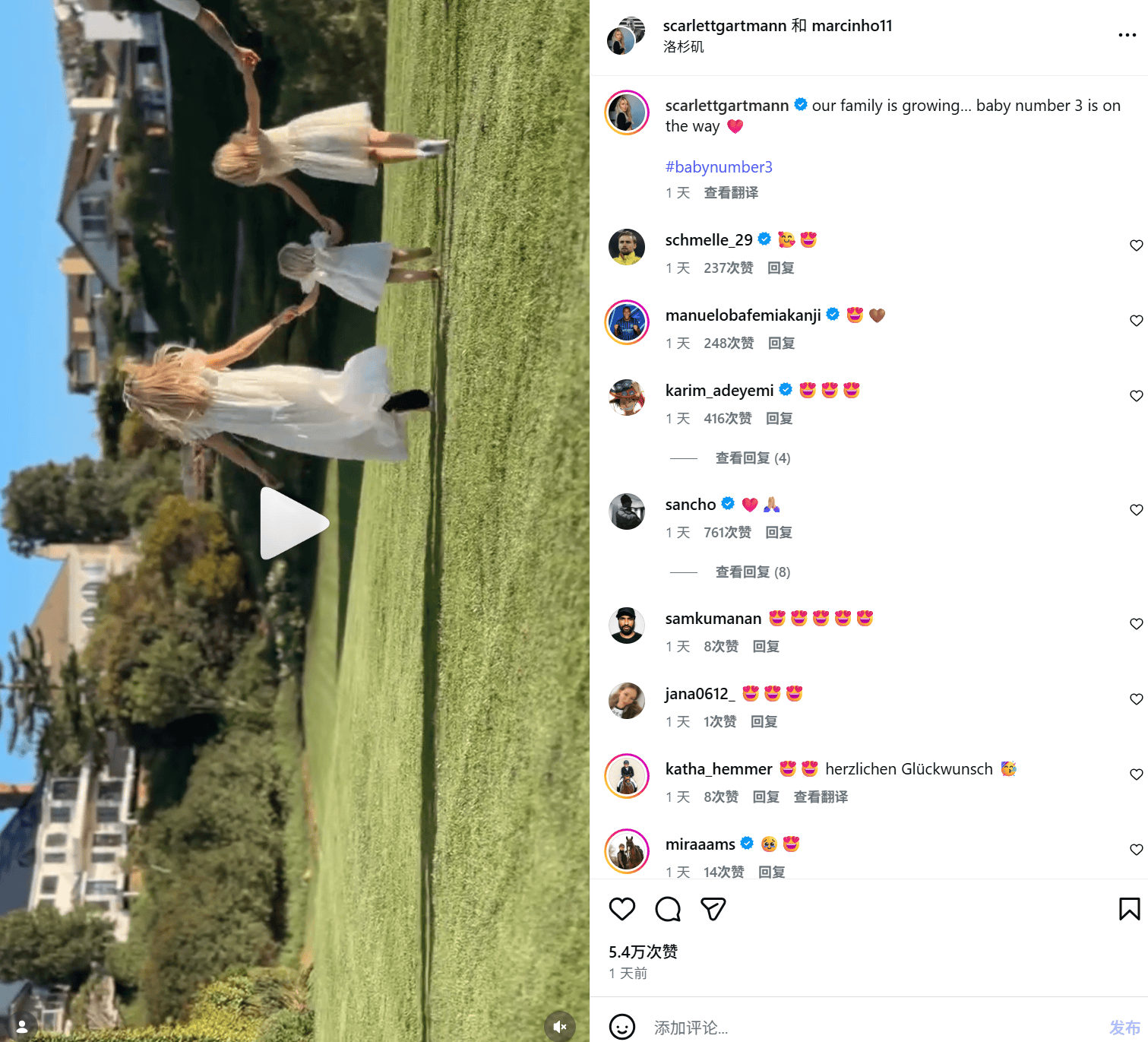 虎扑03月01日讯早前,效力于洛杉矶银河的德国球星罗伊斯和妻子斯嘉丽-加特曼更新了社交媒体,向大家分享了一则新动态——两人即将迎来他们的第三个孩子。