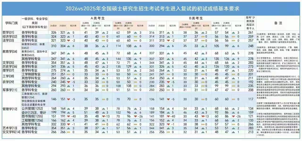 2026年考研国家线公布,整体呈现出“稳中有涨、冷热分化”的态势。与2025年相比,绝大多数专业分数线有小幅上涨,仅有少数专业微降或持平。 尽管报考人数有所减少,但分数仍是涨多降少,上涨成为主流。约70%的专业分数线较2025年有所上调,涨幅集中在1 - 6分。其中,教育学(涨6分)、哲学(涨5分)、历史学(涨5分)涨幅居前,竞争加剧态势显著。 有少数几个专业“降温”:法学(降2分)、农学(降5分)、工商管理(MBA)(降5分)分数线出现回落,报考热度有所缓和。 高分段赛道依旧:文学和艺术学分数线并列最高(354分),且均上涨3分,依旧是考研竞争最为激烈的“天花板”。 该如何解读这种趋势呢? 人文社科“卷”度升级:教育学、文学、哲学等专业分数线上涨,反映出在就业压力之下,文科生“被动考研”群体增多,抬高了竞争门槛。 理工医稳中有升:理学、工学(非照顾专业)、医学分数线普遍微涨1 - 4分,这表明即便报考人数下降,优质生源的竞争依旧激烈。 政策导向明显:工学照顾专业和军事学分数线连续持平,体现了国家对艰苦及战略急需专业的扶持;农学大幅降分则意在吸引生源,保障基础学科招生。 考研达人张雪峰直言,分数线涨跌与报考人数关系不大,主要取决于两点: 一是当年试题难度,题目偏向基础,高分增多,分数线自然容易抬升; 二是考生整体发挥,公共课、专业课发挥稳定,整体分数区间上移,分数线也会随之调整。 目前更重要的是,重视“复试”!往年初试分数高却被刷下来的情况并不少见。