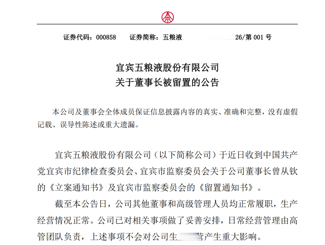 2月28日晚间,五粮液(000858)发布公告称,公司于近日收到中国共产党宜宾市纪律检查委员会、宜宾市监察委员会关于公司董事长曾从钦的《立案通知书》及宜宾市监察委员会的《留置通知书》。