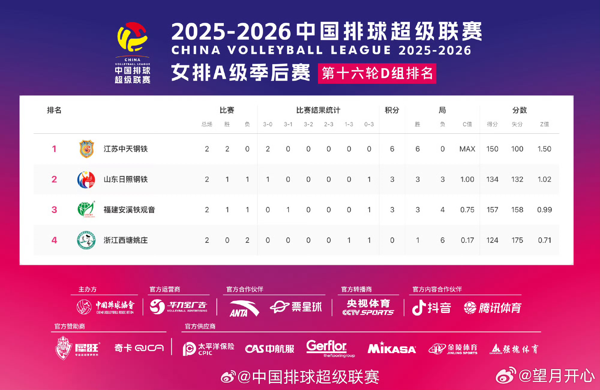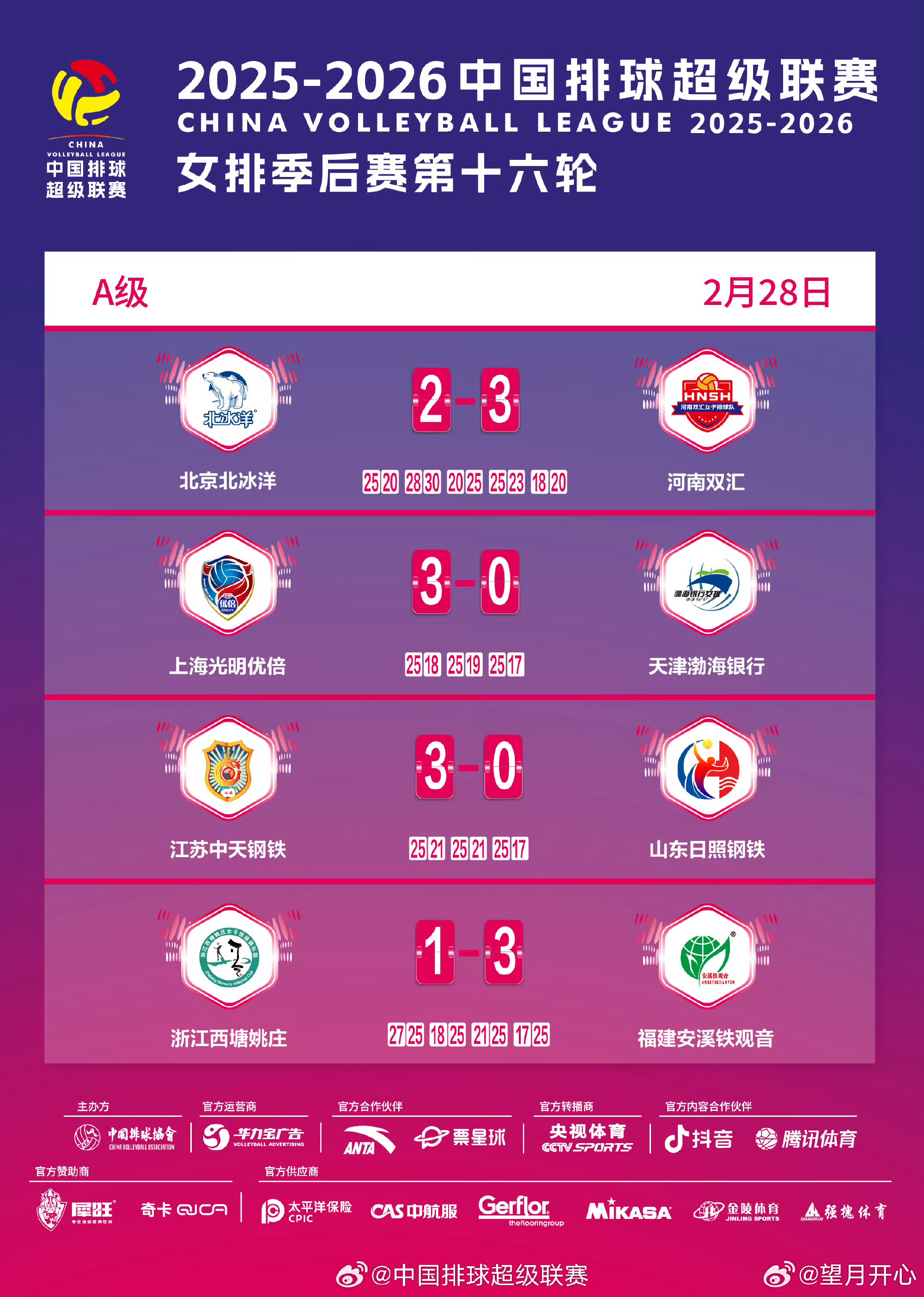 2025-2026赛季中国女子排球超级联赛女排超级联赛季后赛A级组别结束第二轮C组北京女排2-3河南女排上海女排3-0天津女排D组江苏女排3-0山东女排浙江女排1-3福建女排世界女排新闻体育大拜年