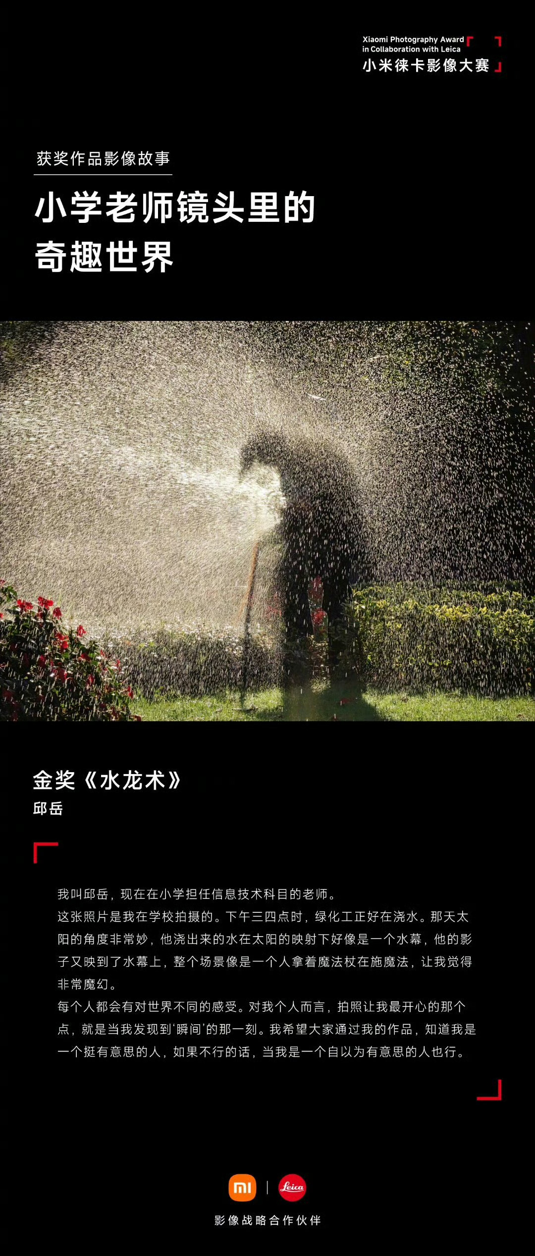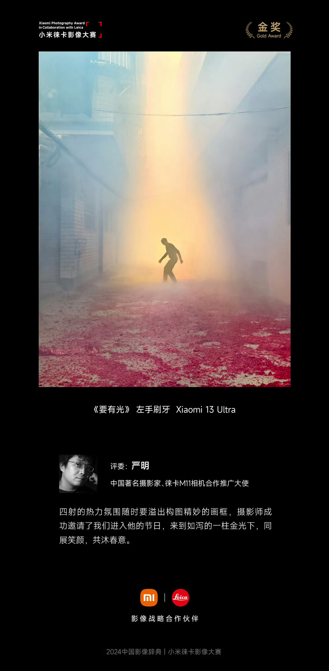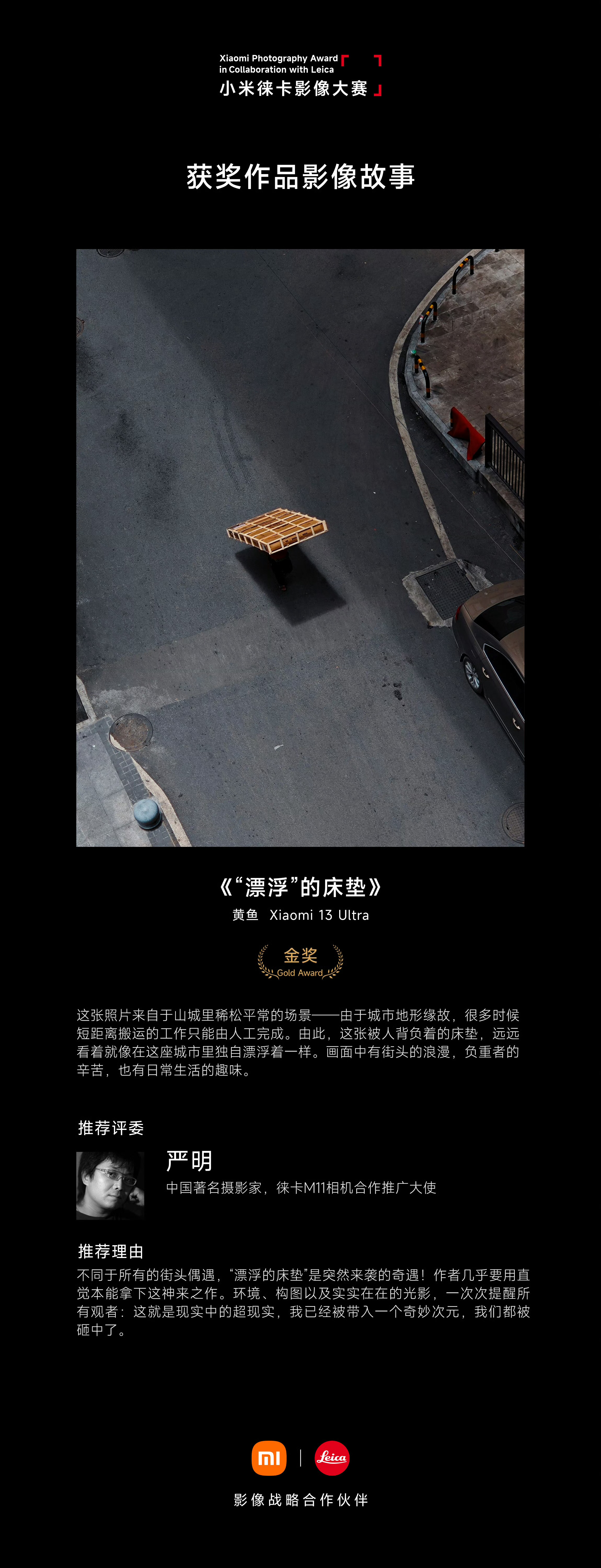 这也说明了小米和徕卡影像大赛并不是一个认人或者纯粹追求技术的比赛,即便是一个摄影小白甚至没有摄影基础的人,甚至是我这样的,只要能在照片中传递出勾起人思考或者引发情绪的东西,甚至哪怕有一瞬间的闪光点,那都有可能拿奖,我觉得这样的比赛恰恰是最具参与感,也是最有意义的。