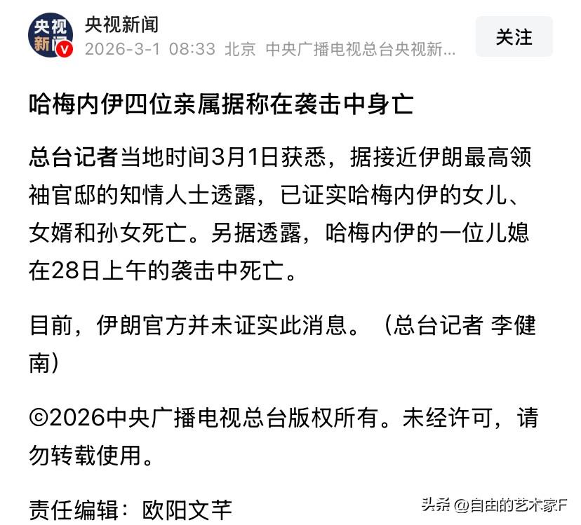 特朗普:哈梅内伊已死,女儿媳妇4位亲属也不在了 美国和伊朗的冲突已经来到第二天,双方现在已经进入了舆论战,特朗普在社交平台透露:得益于美国和以色列高精密的情报网,伊朗最高领袖哈梅内伊已经被炸死。内塔尼亚胡也发出同一种声音强调,哈梅内伊的尸体已在废墟中被找到。 与此同时,根据央视报道,接近伊朗最高领袖官邸的知情人士透露,在美国和以色列28日上午的袭击中,哈梅内伊的女儿、女婿,儿媳和孙女死亡。 伊朗方面对于美国和以色列的信息予以否认,称人在开战前已经进行了转移,哈梅内伊正在作战指挥室指挥。但是也有几个疑点值得大家关注。 1、在28日的战斗之后,伊朗官方曾透露哈梅内伊将会发表全国电视讲话,但是消息颁布之后截止到现在已经11个小时,没有讲话流出,早晨这个结果就是要么人已经不在了,要么就是人在,但是不让对方进行追踪 2、哈梅内伊在数月前已经做好了万全的准备,建立起了一套完整的继承体系,给每个政府重要职位安排了四个继承人,说明他也意识到,如果美国和以色列打击的强度会有多大。
