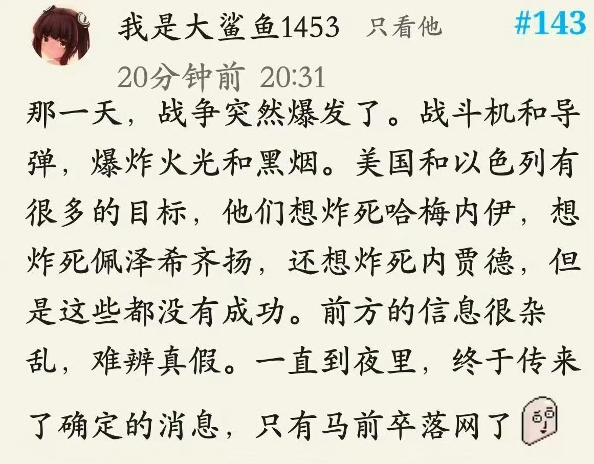 那一天,战争突然爆发了。战斗机和导弹,爆炸火光和黑烟。美国和以色列有很多的目标,他们想炸死哈梅内伊,想炸死佩泽希齐扬,还想炸死内贾德,但是这些都没有成功。前方的信息很杂乱,难辨真假。一直到夜里,终于传来了确定的消息,只有马前卒落网了。