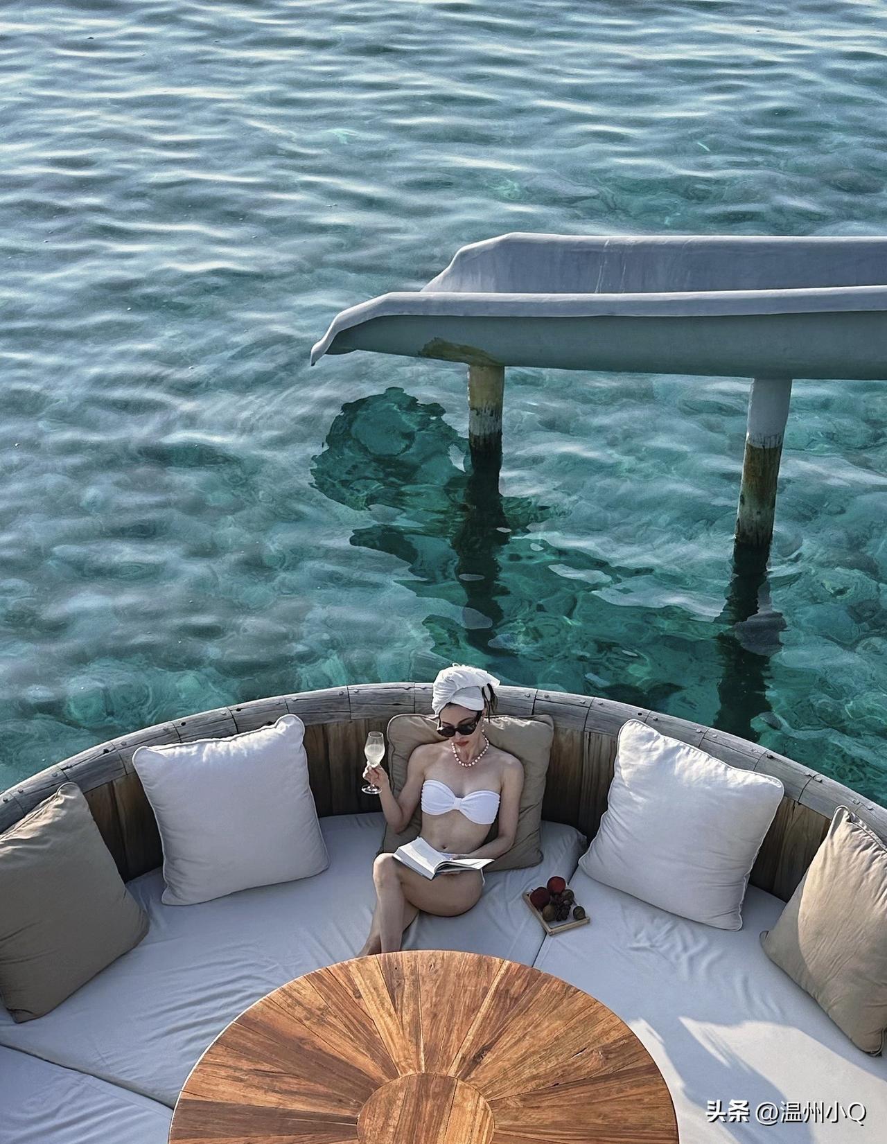 钟楚曦在马尔代夫度假,皮肤晒黑了许多,穿着比基尼喝着香槟,贵妇范十足。有钱有闲还