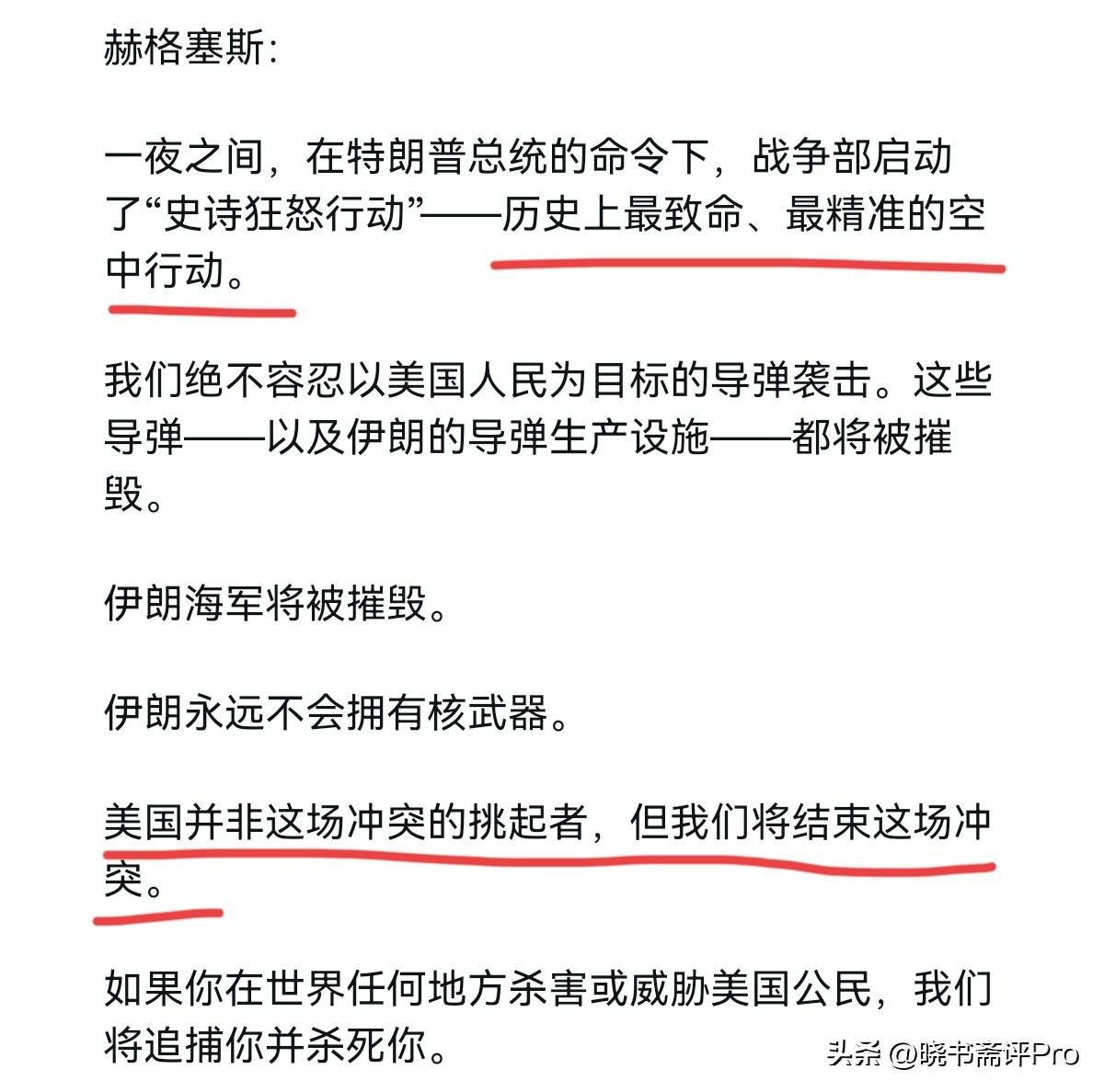 美国战争部长赫格塞斯对伊朗放了狠话!3月1日,赫格塞斯表示,一夜之间,在特朗普总统的命令下,战争部开始了历史上最致命和最精确的空中行动。我们不会容忍导弹瞄准美国人民。这些导弹-以及伊朗的导弹生产-将被摧毁。伊朗海军将被摧毁。 伊朗永远不会拥有核武器。美国没有挑起这场冲突,但我们将结束它。如果你在世界任何地方杀害或威胁美国人,我们会追捕你并杀了你。很显然,赫格塞斯的意思很清楚,美国的空袭精准有效,美国就是要摧毁伊朗的战争潜力,并绝对不会允许伊朗拥核。 不过,赫格塞斯称“美国没有挑起这场冲突,但我们将结束它”,就显得格外的可笑了。难道这一次是伊朗主动攻击了美国和以色列吗?再者,虽然美国妄图对伊朗构成毁灭性打击,击杀伊朗最高政治领导层,但是美以的图谋明显是落空了。这一次,伊朗明显比去年准备的更加充分。 伊朗的导弹回击不仅突破了以色列的防卫系统,美国在中东多个军事基地被击中,并造成了人员伤亡。而至于所谓的这是历史上最致命和最精确的空中行动,这无疑是吹嘘和不负责任。如果美国的导弹足够的精准,为什么美以的导弹会击中伊朗的学校,并导致51人死亡,60多人受伤,造成巨大的人道悲剧。很显然,战争已经打响,伊朗的回击证明,伊朗不会屈服。