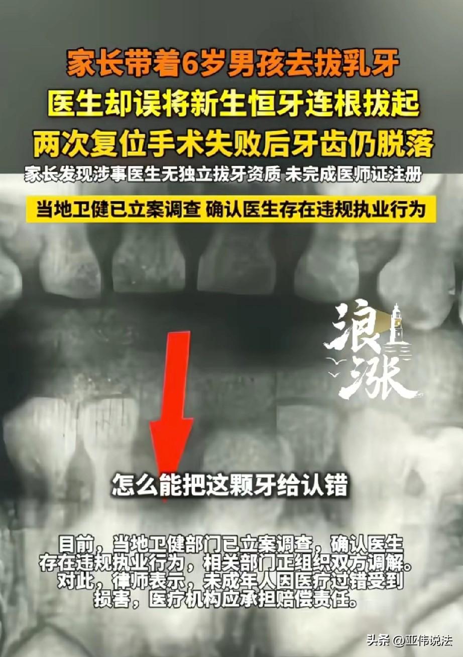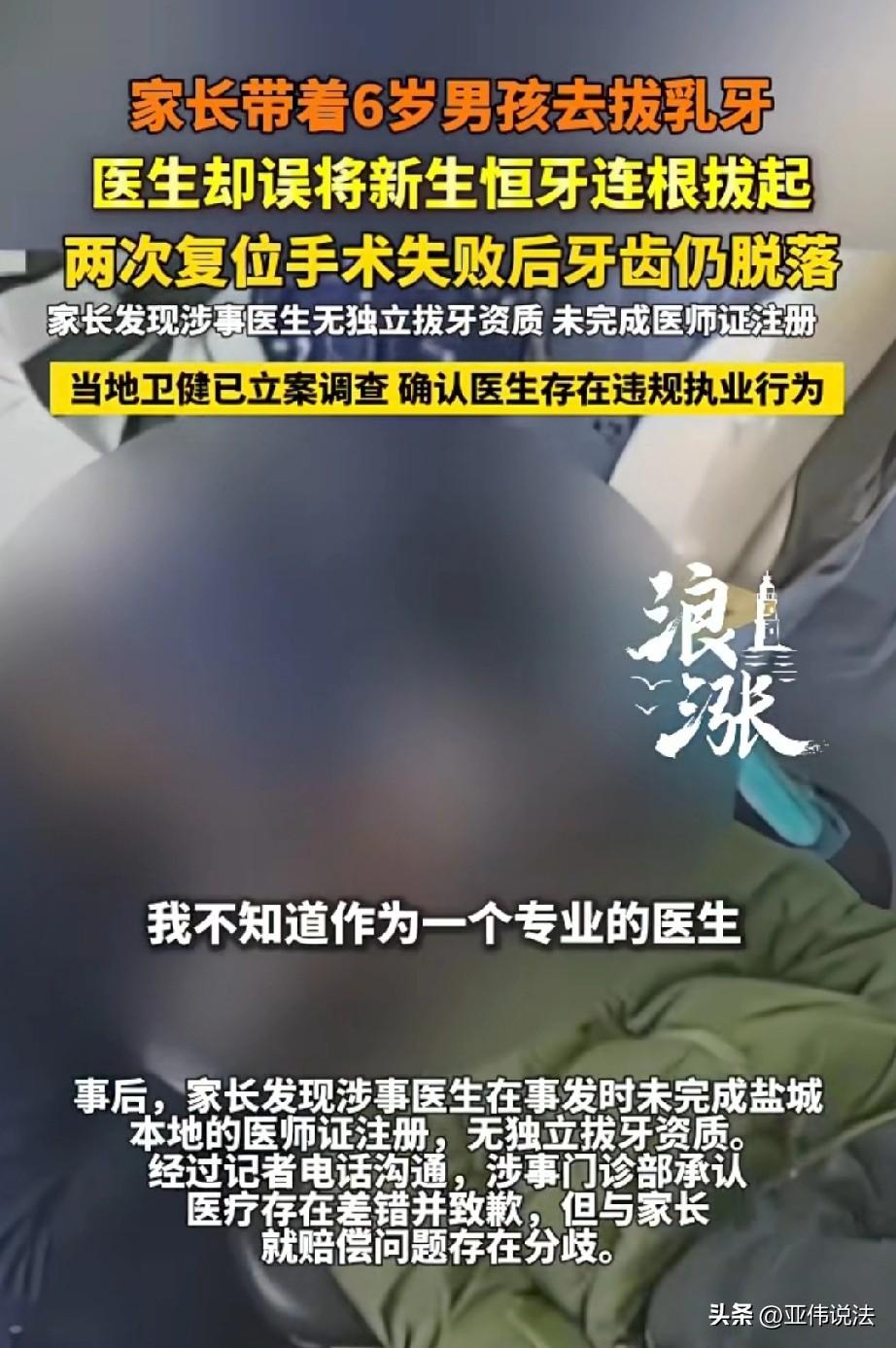 医德何在?江苏盐城,母亲带6岁儿子去口腔医院拔乳牙,不知道是粗心大意还是理解有误,医生竟然把孩子新长出的两颗恒牙连根拔起。确诊拔错牙后,医生先后两次给孩子进行复位手术,结果两次手术都失败,导致错过了最佳治疗时机,这两颗恒牙也很可能无法保住。事后,母亲才得知,该医生并不具备拔牙资质,医生有错不用说,但孩子的恒牙到底该怎么办? 李女士带着6岁的儿子盼盼去口腔门诊拔乳牙,结果却遭遇了一场让她悔恨至今的意外。 前段时间,李女士发现盼盼嘴里一颗乳牙迟迟不掉,新牙已经从旁边悄悄长了出来。 她担心影响孩子牙齿发育,便特意带着盼盼来到当地一家口腔门诊部,想让医生把滞留的乳牙拔掉。 李女士全程都很放心,觉得拔乳牙是很小的操作,医生肯定不会出错,完全没料到会发生严重问题。 接诊医生简单看了一眼孩子的牙齿,很快就开始操作。没一会儿工夫,牙齿就拔完了。 拔完牙后,李女士没多想,带着盼盼回了家。 可到家没多久,她越看孩子的牙口越觉得不对劲,仔细一对比才发现,被拔掉的根本不像是乳牙,更像是刚长出来的新恒牙。 李女士心里又慌又怕,立刻带着盼盼赶回门诊。 医院赶紧给孩子做了CT检查,结果一出来,所有人都愣住了,医生确实拔错了,被连根拔起的不是滞留乳牙,而是盼盼新长出的两颗恒牙。 李女士当场崩溃,心疼得直掉眼泪,孩子才6岁,恒牙是要陪一辈子的,这一错,可能就是终身影响。 为了补救,医生赶紧给盼盼做了恒牙复位手术,结果手术并不成功,盼盼的恒牙还是继续脱落。 李女士抱着最后一丝希望,祈祷能把孩子的牙齿救回来。医生这次拍着胸脯保证:手术肯定没问题,恒牙能修复,让她把心放肚子里。 可现实十分残酷,第二次手术做完没多久,盼盼错拔的恒牙再次脱落下来。 接连两次手术全都失败,恒牙还是没能保住,盼盼也错过了最佳治疗时机,医生坦言,这两颗恒牙基本无法挽回了。 更让李女士无法接受的是,事后她才得知,给盼盼拔牙的这位医生,并没有在盐城完成医师证注册,不具备独立拔牙资质,属于违规执业。 面对这样的事实,涉事口腔门诊承认存在医疗差错,也向李女士和家人道了歉。 但一提到赔偿问题,医院却死活不松口,不愿意按照李女士主张的方案赔偿,双方一直谈不拢。 目前,当地卫健部门已经立案调查,确认医生存在违规执业行为,相关部门也在组织双方调解。 看着小小年纪的盼盼承受这么多痛苦,将来还要面对牙齿修复、美观和功能上的一系列问题,李女士满是自责和愤怒。 她怎么也想不到,一次普通的拔牙,会因为医生的失误和违规操作,给孩子带来无法弥补的伤害。 《民法典》第一千二百一十八条规定:患者在诊疗活动中受到损害,医疗机构或者其医务人员有过错的,由医疗机构承担赔偿责任。 医生误拔恒牙、无资质违规执业,存在重大过错,与孩子恒牙无法保住存在直接因果关系,门诊必须承担全部赔偿责任,包括医疗费、护理费、后续修复费及精神损害抚慰金。 此外,医生未注册执业属于严重违规,卫健部门完全可以依法处罚。 但不管怎么处罚,怎么赔偿,6岁孩子的恒牙不可逆受损,给童年与成长带来长期的伤害。 所以说,善良与信任不该被疏忽践踏,医疗安全容不得半点马虎。 对此,你怎么看?