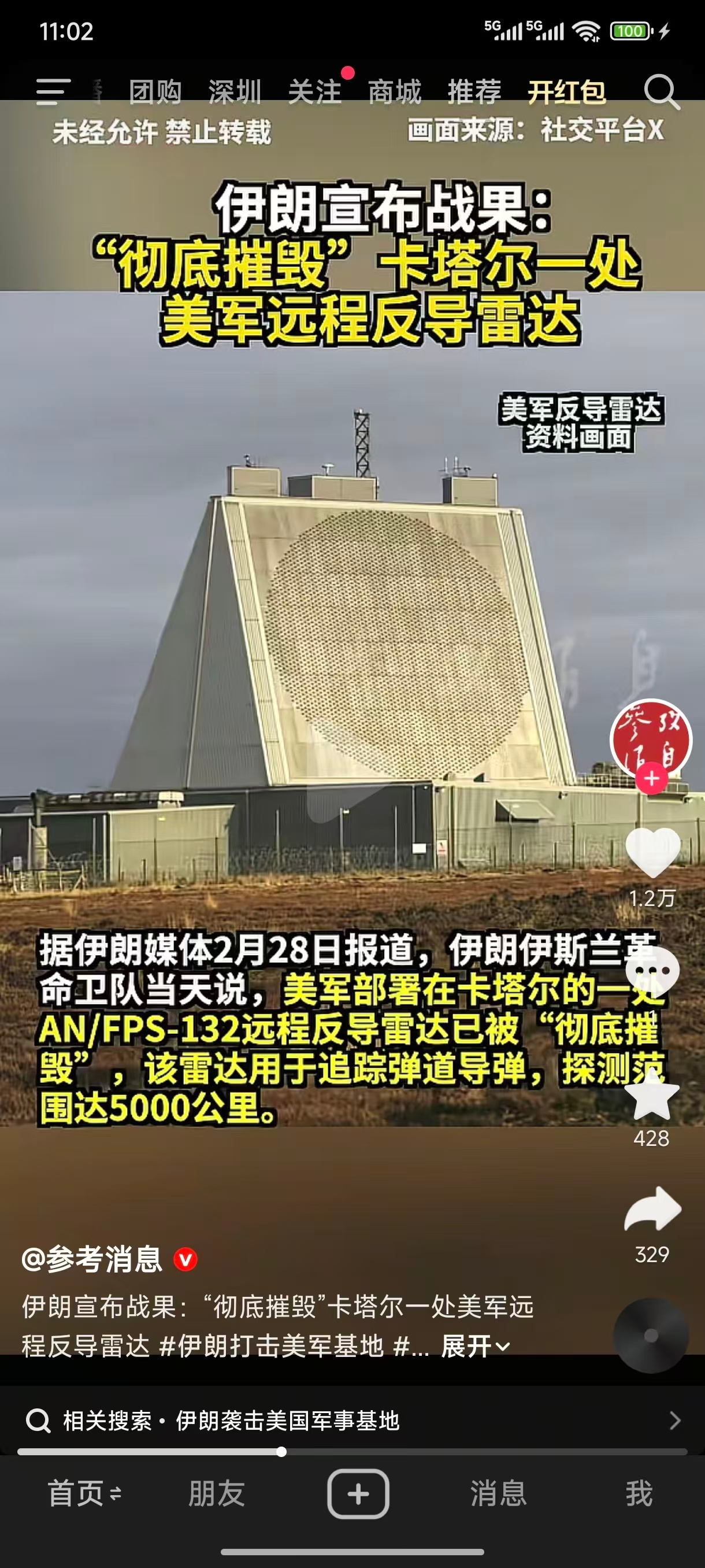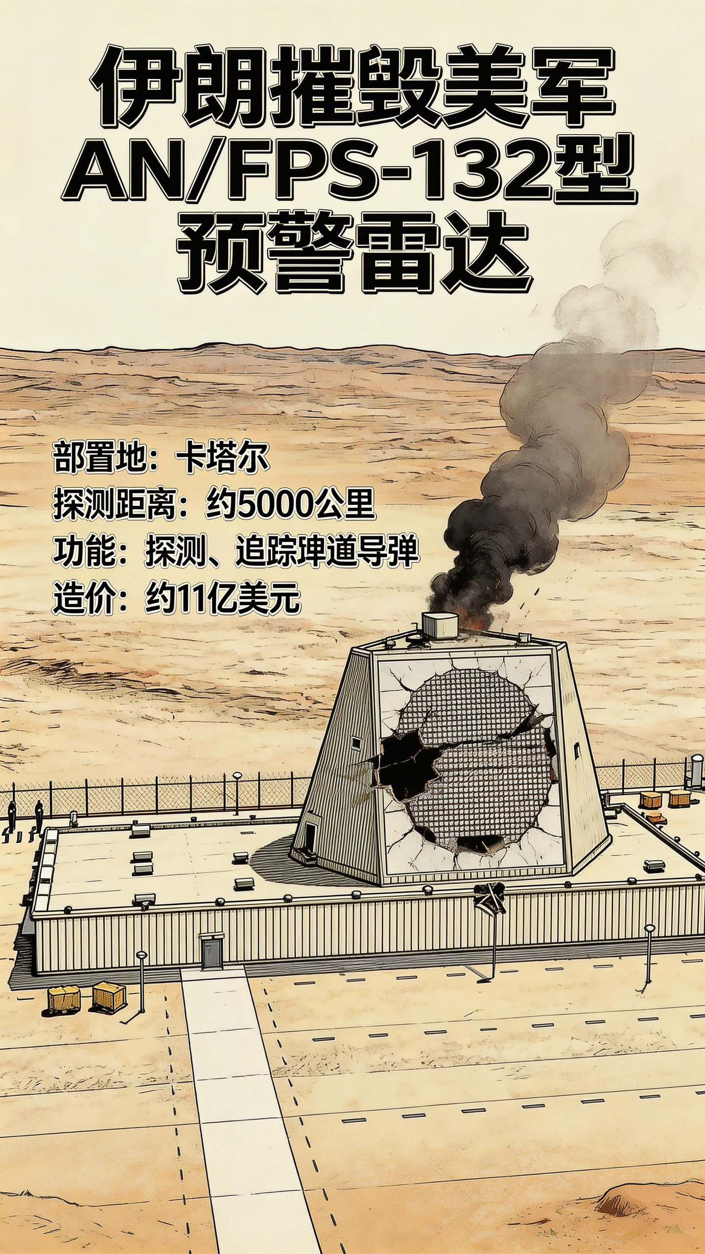 造价11亿美元的铺路爪雷达,被伊朗彻底摧毁!这波美军血亏,伊朗血赚!伊朗革命卫队宣布,他们成功摧毁了一套位于卡塔尔的美军AN/FPS-132型预警雷达系统。这可不是一般的雷达,而是美军大名鼎鼎的远程战略预警雷达-“铺路爪”。其探测距离约5000公里,采用先进的固态相控阵技术,能够实时扫描并处理海量数据,主要用于探测和追踪伊朗全境弹道导弹发射活动。建造成本约11亿美元,可以说是美军在卡塔尔的重磅投入。从地理位置上看,这款雷达距离伊朗本土最近点只有约190-250公里,几乎就是贴着脸部署。然而,这个距离完全在伊朗导弹的射程之内。美国显然自信满满,就是笃定了伊朗不敢打。但现实证明,这种“笃定”成了致命的误判。作为一款固定式部署的雷达,“铺路爪”的最大弱点在于机动性差,无法快速转移或隐藏。为了追求极致的探测功率和稳定性,雷达体积庞大、位置固定,且为了电磁环境需求,往往选址开阔。一旦定位确认,它就成了战场上的“活靶子”。在和平时期,这款雷达确实发挥了巨大作用,能持续监控伊朗的导弹测试和发射动态,提供情报支持。但在战时,它注定是敌方第一波打击的优先目标,而且还是高价值目标。据报道,此次打击采用先进的“电子干扰+导弹饱和攻击”复合战术。先以自杀式无人机瘫痪雷达通信,再以精确制导导弹命中雷达主体。要知道,伊朗使用的导弹、无人机成本只有几万到几十万美元,而铺路爪雷达造价可是11亿美元。这简直就是教科书级的不对称作战。打掉一个,血赚;打不掉,也能吓美军一跳。伊朗这是在“戳眼睛”,先把美军雷达预警网废了,让对手变成聋子瞎子。当美军看不见、听不见的时候,才是真正的噩梦开始。接下来,伊朗如果发动更大规模的无人机“蜂群”或导弹雨,美军将面临拦截效率大幅下降的窘境。如果伊朗没有虚报战果,那么美军现在是骑虎难下。如果不报复,美军在中东的威慑力将荡然无存,盟友会对美军保护能力产生严重怀疑,11亿美元的缺口也急需填补;如果报复,局势升级,伊朗显然已经做好了后续“大餐”的准备,且美军在该区域的防御网已现破绽。