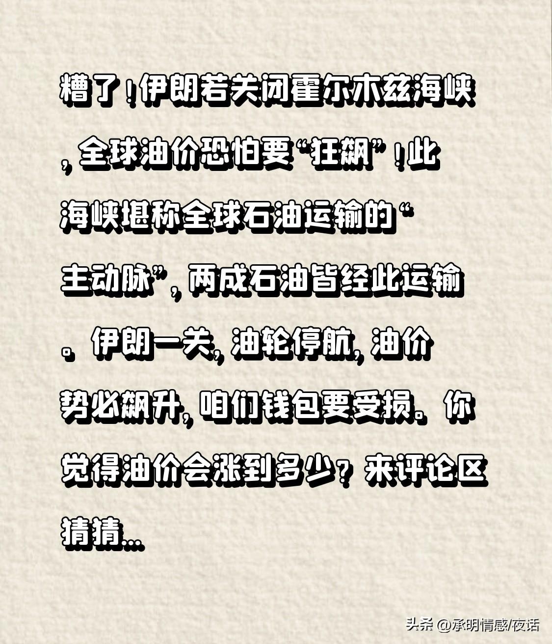 糟了!伊朗若关闭霍尔木兹海峡,全球油价恐怕要“狂飙”! 此海峡堪称全球石油运输的“主动脉”,两成石油皆经此运输。伊朗一关,油轮停航,油价势必飙升,咱们钱包要受损。 你觉得油价会涨到多少?来评论区猜猜,点赞收藏,一同关注油价动态! 伊朗上空封锁 伊朗航线 伊朗石油禁令