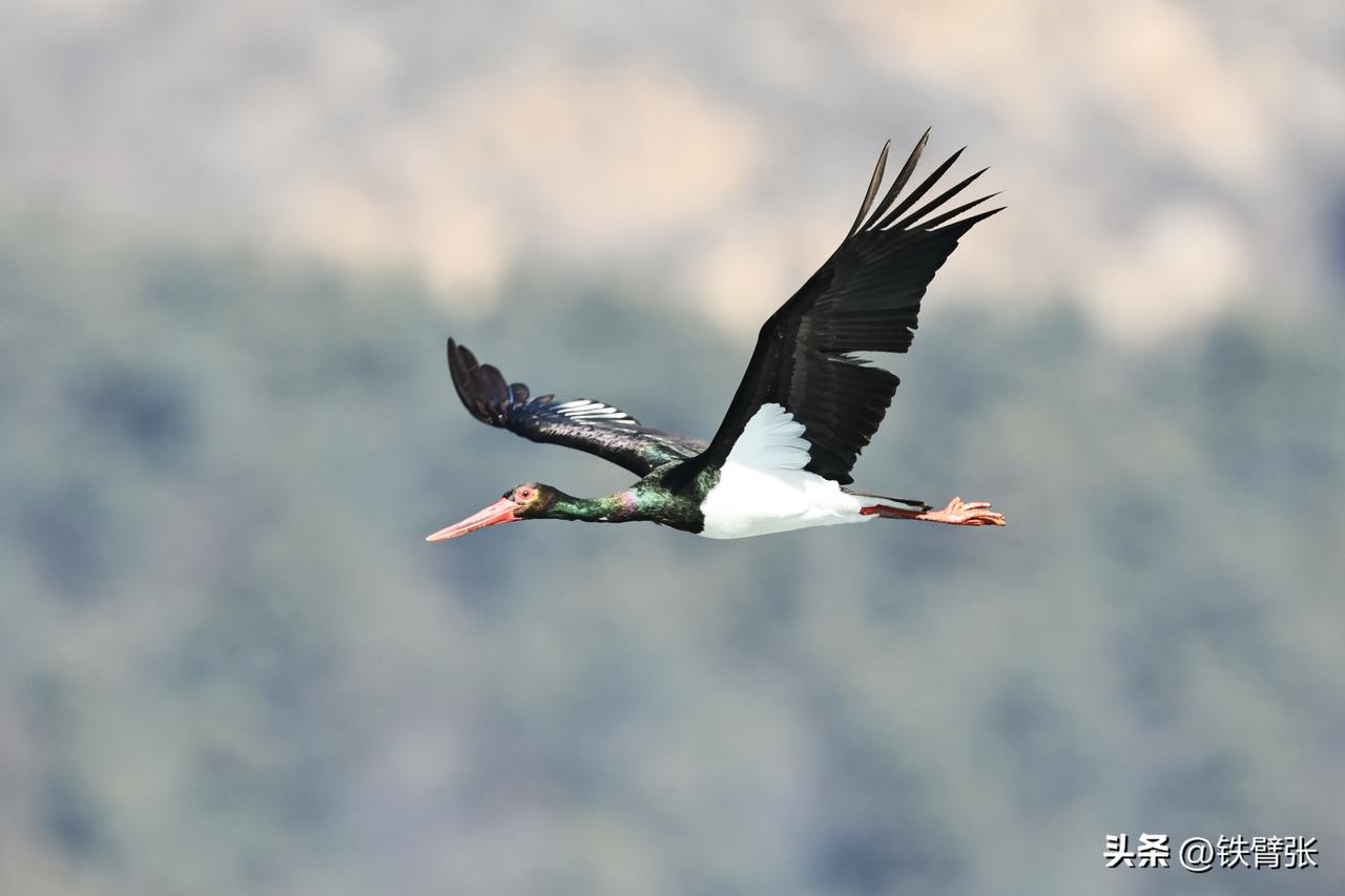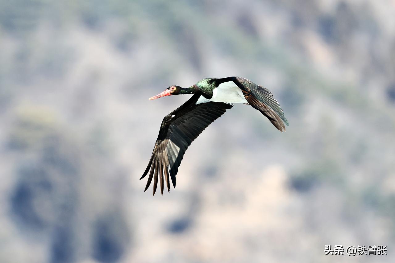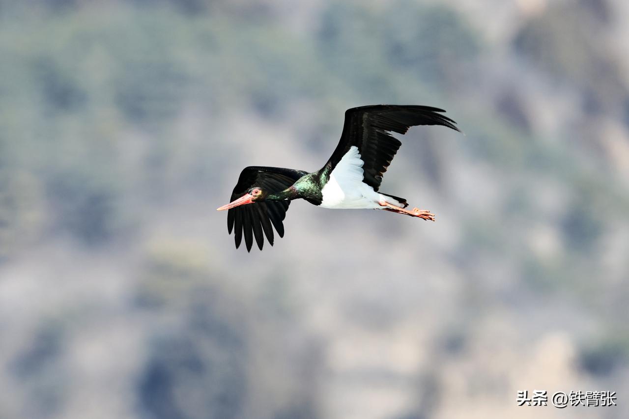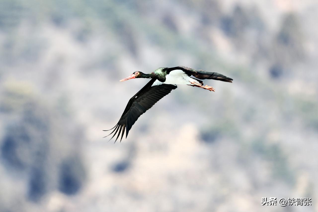 国家一级保护动物黒鹳飞过西峪大桥