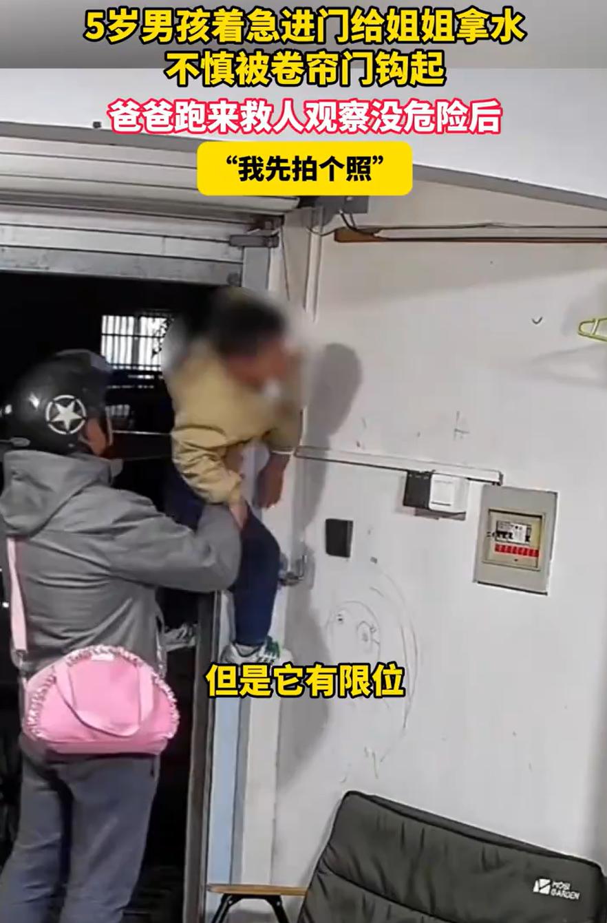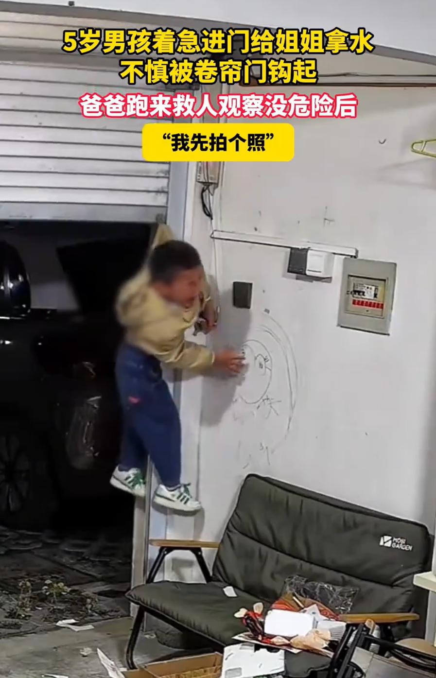 心够大的!江苏常州,一男孩去车库拿水,一不小心被卷帘门钩起挂在半空,孩子被吓得不行,可父亲赶到后发现暂时没有危险,竟然是先拍照发朋友圈,然后才把孩子给救下来,网友:理解不了 监控显示,小男孩走进车库,就站在门口的位置伸手去够墙上的开关,想开灯。谁想到身后的卷帘门正在缓缓上升,刚好刮住了孩子的衣服,直接就把他带离了地面。孩子整个人挂在门上,吓得哇哇大叫,两条小腿在空中乱蹬,场面确实挺惊险 孩子的父亲刘先生听到动静后赶紧跑过来,可这位老哥观察了一下,发现卷帘门有自动限位功能,不会把孩子卷进去,孩子虽然悬空但没受伤。于是这位当爹的做出了一个让很多人意想不到的决定,他掏出手机,对准挂在门上的儿子,拍了一张照片留念 父亲刘先生介绍,他姐姐赶着去跳舞想喝水,他着急钻进车库拿水,不慎被卷帘门钩起挂在半空,卷帘门有自动限位,不会把孩子卷进去,我看他没受伤就给他拍了张照片 事后,刘先生还把这个事发到了网上,但很多网友却表示不能理解 有网友说:把孩子吓得不轻,你知道没有危险,可是孩子不知道啊 作为旁观者,我们其实很难评判这位父亲的做法是对是错。每个家庭都有自己的相处方式,每对父母都有自己的教育理念。只是这件事提醒我们,在孩子遇到惊吓时,哪怕事情本身不严重,孩子的内心感受也是需要被看见和被安抚的 等孩子长大后再看这张照片,可能会笑自己当年的窘态,也可能会理解父亲当时记录生活的用意。但在被挂起来那一刻,如果父亲能先抱抱他,告诉他没事了,那张照片的意义可能会更加完整 毕竟记录生活的方式有很多种,但给孩子安全感的时机,错过了就真的错过了