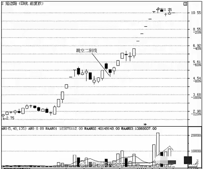 形态二,跳空双阴出现时,成交量明显萎缩,比前期上涨时的量能要小,说明主力并未出货,只是在吓唬人