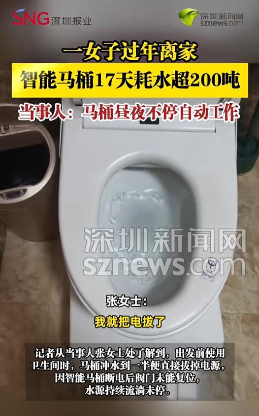 “万万没想到!”近日,河南洛阳,一女子春节期间,回老家过年,过完年返程途中却收到了自来水公司的消息,提醒她家里面用水异常。女子一看惊呆了,自己家里竟然莫名跑掉了200吨水。回去一看,竟是智能马桶惹的祸!网友:马桶漏水了? 科技日新月异,智能家居逐渐进入普罗大众的生活。语音灯、智能马桶等走进千家万户,给人们另外一种生活体验。智能家居虽然好用,可一定得仔细了解它的使用方式,操作失误就会带来不必要的损失。 据媒体2月28日报道,张女士家中安装了智能马桶,春节期间,她回老家过年了,就把家里的电都断了。没想到过完年返程途中,自来水公司给她发来消息,说她家里用水量异常,短短17天用掉了200吨水。 这可把张女士吓了一跳,回到家中赶紧进行排查,发现家里的智能马桶竟然还在淌水。原来,张女士走之前,智能马桶冲水冲到一半她就把电源插头给拔了。断电后,马桶的阀门没有复位,张女士大意了也没有检查,水就这样源源不断流了半个多月,平均一天跑11吨多。 网友看后表示,这锅可甩不到智能马桶身上,自己粗心大意惹的祸。等马桶冲完再断电,或者临走前再去看一眼,都不会出现这个问题。就当花钱买个教训吧,以后可不敢这么大意了! 信息来源:《【一女子过年离家,智能马桶17天耗水超200吨】当事人:马桶昼夜不停自动工作