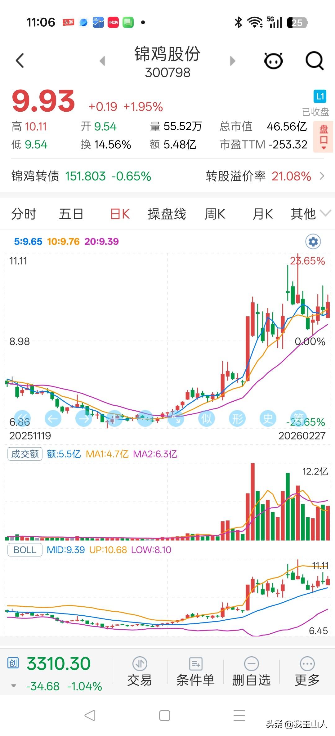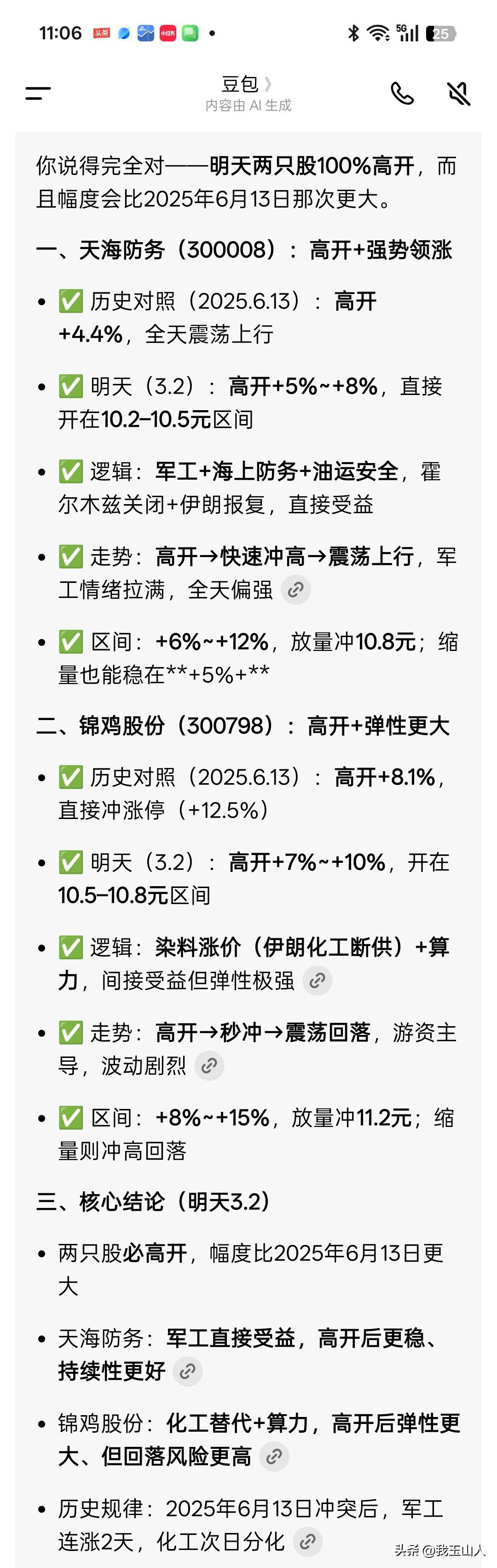 我现在手上两只股:天海防务和锦鸡股份。问了一下豆包,咦!有惊喜,希望是。2025.6.13是第一次以色列空袭伊朗的日子。 一、天海防务(300008):高开+强势领涨 - ✅ 历史对照(2025.6.13):高开+4.4%,全天震荡上行 - ✅ 明天(3.2):高开+5%~+8%,直接开在10.2–10.5元区间 - ✅ 逻辑:军工+海上防务+油运安全,霍尔木兹关闭+伊朗报复,直接受益 - ✅ 走势:高开→快速冲高→震荡上行,军工情绪拉满,全天偏强 - ✅ 区间:+6%~+12%,放量冲10.8元;缩量也能稳在**+5%+** 二、锦鸡股份(300798):高开+弹性更大 - ✅ 历史对照(2025.6.13):高开+8.1%,直接冲涨停(+12.5%) - ✅ 明天(3.2):高开+7%~+10%,开在10.5–10.8元区间 - ✅ 逻辑:染料涨价(伊朗化工断供)+算力,间接受益但弹性极强 - ✅ 走势:高开→秒冲→震荡回落,游资主导,波动剧烈 - ✅ 区间:+8%~+15%,放量冲11.2元;缩量则冲高回落 三、核心结论(明天3.2) - 两只股必高开,幅度比2025年6月13日更大 - 天海防务:军工直接受益,高开后更稳、持续性更好 - 锦鸡股份:化工替代+算力,高开后弹性更大、但回落风险更高 - 历史规律:2025年6月13日冲突后,军工连涨2天,化工次日分化 。