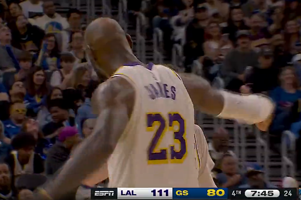 第四节比赛中,詹姆斯妙传拉拉维亚三分领先勇士31分,随后双方换下主力。
