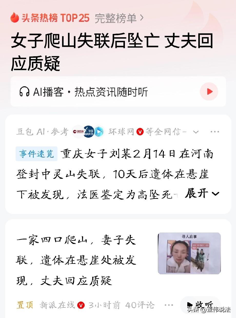 太离奇了!河南登封,一家四口从重庆来到未开发的景区爬山,因为带着两个孩子和行李箱,他们直到傍晚才到达山顶。登顶后,妻子出现神情异常,孩子也到处乱跑,男子只能拨打119求助,然后赶紧去追孩子。等把孩子安顿好,男子又发现妻子不见了,经过搜救,最终在悬崖下找到了妻子的遗体。有人质疑,大冬天的,妻子光着脚穿着睡衣爬山坠亡,这肯定有什么隐情。还有人觉得,男子知道妻子神情异常,还是不管不顾,这肯定是不爱了。 2026年春节将近,33岁的重庆女子刘某主动提出,要带着丈夫和两个孩子,去河南登封的中灵山祈福。 夫妻俩原本在老家经营着一家彩票店,平时日子过得安稳,看到妻子想出去玩,他也不好拒绝,就收拾行李出发。 出发前刘某一切正常,家里也没什么矛盾,谁也没想到,这场跨省祈福之行,最后会变成一场悲剧。 2月14日中午一点多,一家四口从重庆赶到登封中灵山脚下。这座山属于未开发景区,没有门票、没有专人管理,山路崎岖,徒步上山要三个多小时。 更吓人的是,山顶的安阳宫还不通电,晚上一片漆黑,旁边就是没有护栏的悬崖,本地人都不建议傍晚之后上山。 可刘某一家人赶路心切,没多想就准备出发。 更离奇的是,他们明明是开车来的,却拖着行李箱爬山,丈夫后来解释说出发太急,没来得及把行李放车里,只能一路带着。 刚开始爬山时,刘某穿着黑色粗跟鞋、粉色睡裤,带着小儿子先往山上走,丈夫拖着行李箱,领着大女儿跟在后面。 山路本就不好走,再加上带着孩子和行李,一家人走得很慢,中途不停休息,直到傍晚五点多,一家四口才在山顶会合。 刚到山顶,丈夫就发现妻子不对劲:刘某神情恐惧,整个人呆呆的,说话也含糊不清,就坐在地上不肯动,更不愿意下山。 丈夫急着问她怕什么,她只是摇头,一句话也说不出来。 看着妻子状态异常,天又越来越黑,丈夫心里又慌又乱,担心出意外,赶紧拨打119求助。 可就在他打电话的间隙,大女儿突然独自往山下跑,孩子年纪小,深山里天黑路险,丈夫顾不上妻子,立刻转身去追女儿,小儿子见状也跟着跑了下来。 这一找就是一个多小时,等他把两个孩子安顿好,再赶回山顶时,天已经完全黑透了。 当时山顶安阳宫里有一位常住的女士,看一家人又冷又饿,就劝他们到玉皇殿后面的屋里休息。 丈夫本来想守着妻子,可两个孩子冻得发抖、饿得哭闹,他只好先把孩子带进屋里,想着就离开一小会儿,应该不会出事。 世事无常,仅仅过了二十分钟,丈夫从屋里出来,就发现妻子不见了。 山顶没有灯光,四周全是悬崖,丈夫瞬间慌了神,一边喊着妻子的名字,一边四处寻找,当晚十点左右,刘某彻底失联。 后来,有当天上山的网友表示见过刘某这家人。 当时,他们见到刘某的时候,刘某光着脚,穿着粉色睡裤和黑色内搭,丈夫则拉着行李箱走在最后。 丈夫后来解释,妻子穿的粗跟鞋走山路太吃力,实在走不动就把鞋脱了,当时天气寒冷,气温接近零度,一个女人光着脚在山上,看着就让人揪心。 刘某失联后,当地警方、消防和多支救援队立刻展开搜救,可中灵山地形复杂、没有监控,搜救难度特别大。 直到2月24日,失联整整十天后,救援人员才在山顶南侧两百多米的垂直悬崖下,找到了刘某的遗体,经法医鉴定为高坠死亡。 消息传开后,网上全是质疑声。 大冬天穿睡衣、光脚爬山,带着行李箱走野路,妻子状态异常还分开行动,女儿无故独自下山,每一个细节都透着反常。 2月28日,刘某的父亲回应网友的质疑,女儿的尸检已经做完,这几天他一直和女婿配合警方做笔录,该查的都在查。 刘某父亲表示,网上很多传言都不真实,连孩子的年龄都传错了,现在两个孩子已经被爷爷接回老家,家里人都被谣言困扰着。 至于夫妻有没有矛盾、刘某当时的精神状态,刘某父亲只说情况很复杂,一切要等警方的调查结果,用事实和证据说话。 截至目前,当地派出所还在进一步调查此事,没有对外透露更多细节。 一场原本普通的祈福,最终变成阴阳相隔的悲剧,留下两个年幼的孩子和满屏的疑问,真相到底如何,只能等待警方给出最终答案。 《刑法》第二百三十三条规定:过失致人死亡的,处三年以上七年以下有期徒刑;情节较轻的,处三年以下有期徒刑。 丈夫明知妻子神情异常、丧失正常判断力,且身处无照明、无护栏的悬崖边高危环境,作为配偶负有法定救助与看护义务。 他因追孩子短暂离开后,又将妻子独自留在危险山顶,仅20分钟就导致妻子坠亡,属于应当预见危险却因疏忽大意未有效看护,符合过失致人死亡罪的客观要件。 若警方查实丈夫存在故意推搡、胁迫、放任自杀等行为,甚至可能构成故意杀人罪。 当然,如果此事确属意外,丈夫已尽合理救助义务,则不构成犯罪。 最终结果如何,还需结合尸检、现场痕迹与言行证据综合认定。