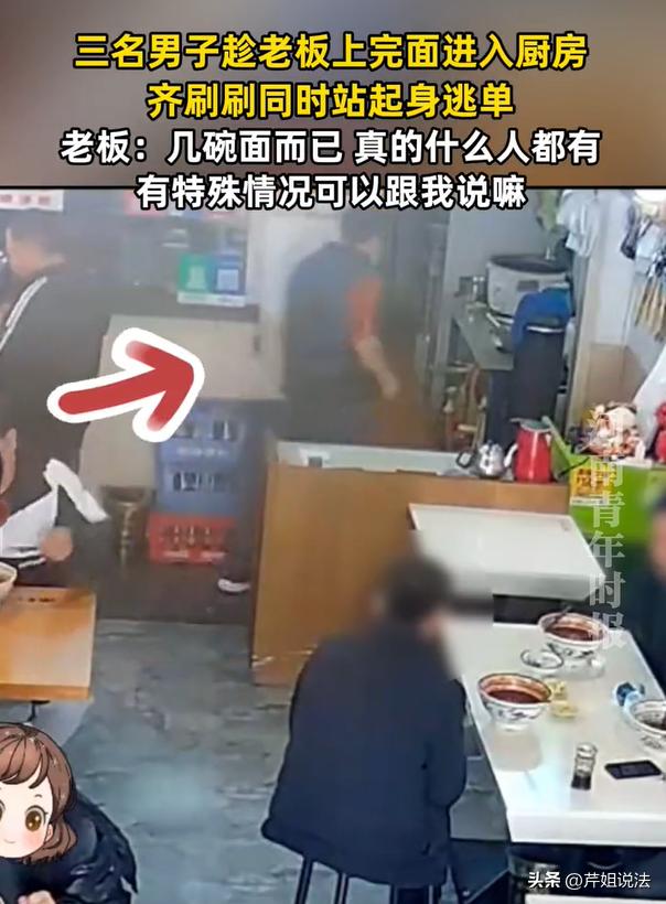 “啥不要脸的人都有。”陕西,一家面馆里走进来3个男人在吃面,席间一直盯着忙来忙去的老板,眼看着三个人快吃完饭,这三人一直贼眉鼠眼地观望、他们在蹲守一个时机。眼看到老板进入后厨布菜,说时迟那时快,三个人齐刷刷地立刻起身火速逃离饭店。老板出来一看,三个人全都逃单了,一个子儿都没付。不尊重劳动人民的辛苦,只想着薅羊毛,这三个人都很可耻。 白吃饭久了会怎样呢?这个不清楚,但是有一点很清楚,“吃白食”、“吃霸王餐”,这些行为是违法的。 观象视频2月28日报道了这则新闻。 一碗面20-30元,老板赚的也就是个辛苦费。 有三个大老爷们,看着是有模有样的,走进了一家面馆坐下来点餐。 面条点好了之后,三人则静坐等待。其间,三个人也互相使了眼色,或许早就盘算好了,今天想要过来“吃白食”。 正常餐厅应该是这样的:都是入座先消费、付完钱再吃饭。 但是老板是个实在人,也就没有这样的规定,大家都是互相信任嘛。他认为,哪里有那么多无赖,吃完饭不付钱呢? 可是,殊不知,眼前就是,还三个! 没多久,热气腾腾的陕西特色面条端上了饭桌,三个人看到面条,内心非常开心,直接开始大快朵颐。 没一会儿,三个大海碗都见了底。 其中还有一个男子,不断地喝汤,继续细细地品尝美味。 眼看着面条快要吃完了,三个男子开始坐立不安,眼睛一直盯着老板看。 原来,他们三个在盘算一个计划:等待一个时机,如果老板进入后厨,一个不注意的情况下,他们三个准备逃单了! 果不其然,忙碌的老板真的进入后厨了,他要到后面去布菜,准备前台其他食客的面条。 看看这三个男子,眼见时机已至,立刻站起来,帽子戴好,手机拿好,擦擦嘴巴,以非常快速的速度,化作风一样的男子,离开了面馆。 老板出来一看,一下子看傻眼,桌子上就留下了三个空碗,人影都没了。 “喂!你们钱还没付呢!”老板一边呼喊,一边跑出去,可是追出门后,哪里还能看到那3个人呢。 回到屋内,老板无奈的叹了一口气。 一开始,没收钱,就是想着信任大家。但是没想到,大部分人都很自觉,这世上还是遗留这么几个无赖,就想着吃“霸王餐”。 旁边的顾客们也都纷纷发表建议:“早就看到他们三个在盯着老板看了,就是在等待一个时机而已。” 老板则表示:有啥特殊情况可以跟我说,有困难是可以照顾的。几碗面而已,不需要搞得这么偷偷摸摸的。 最后,老板将监控调取出来,把这三个人的无赖举动全都发到网上去,希望大家都引以为戒。 第一,看到这三个人,注意一点,小偷小摸之流; 第二,希望大家讲究诚信,不要做这样的人,挂出来,给大家认认无赖长啥样。 本案释法: 三个男子点了三碗面,趁老板不注意,直接脚底抹油逃单,一分钱都没支付。这三个人的行为如何判定呢? 根据《民典法》第577条规定,进入餐厅用餐跟店家形成服务合同关系,点餐后不付款直接离开属于典型的故意逃单行为,涉嫌违法,会被处以行政拘留处罚,另外还需要做出民事赔偿。 逃单构成的行政违法在于,触犯了《治安管理处罚法》第四十九条规定,恶意逃单会被处以5日以上、10日以下拘留,并且处以500元罚款。 另外还需要注意这三个人的动向,老板可以先报一下警,之后查看是否再犯。 如果两年内连续多次作案,不管涉案金额多少,构成寻衅滋事罪,该行为直接就构成刑事违法,会被判入刑。 所以,不要以为逃单金额小,就可以无所谓,这样的行为本身就是比较恶劣、产生了深重的影响,“白吃”可不是这么容易吃的! 白吃白喝、恶意逃单,如今的饭店里面都有监控,确定要做这样“不要脸”的事情吗? 这些人的素质、造化,真的在逃单这一刻,全都化为乌有。人品、素质早就被自己践踏在脚底下了。 唯有“法律”可以惩处这样的人,也不需要讲道理,接受法律制裁,法律教他们做人,或许一教就会。 对于本案,您看了之后作何感受呢,欢迎一起来讨论吧!
