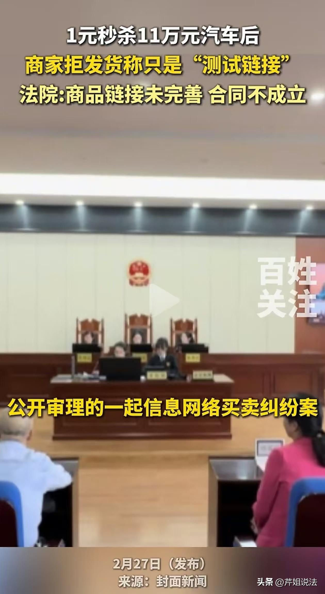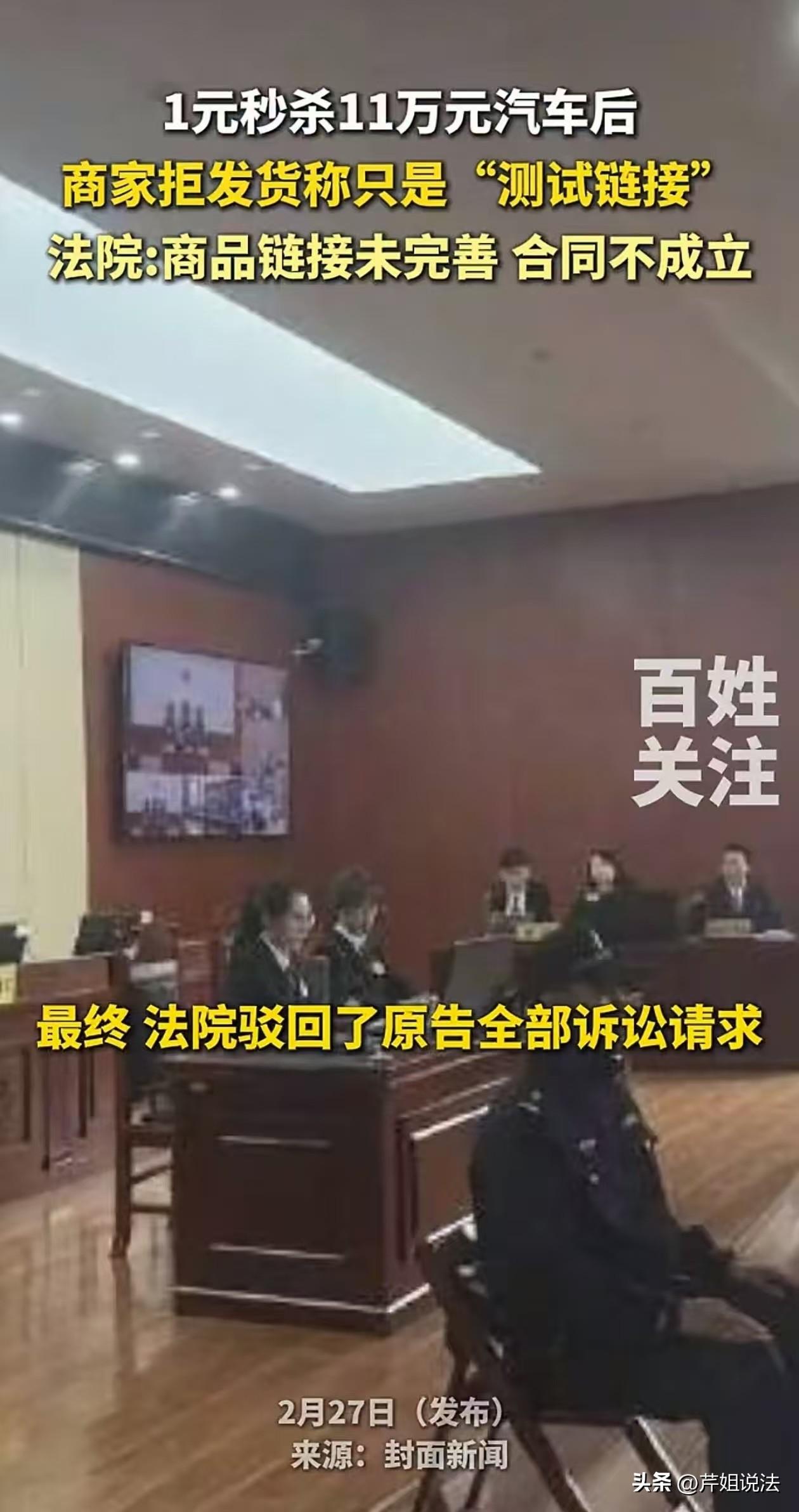 1元秒杀11万元汽车?成都,小文参加了某电商平台的汽车销售活动,仅用1元钱便成功买下了价值11万元的汽车,本以为是天降馅饼、老天眷顾,可店家说这只是他们在测试链接,不算数! 据小文阐述,他在某电商平台浏览时,竟意外惊喜发现在某汽车店铺下,一辆汽车的价格仅仅只标注1元钱,小文赶忙付了一元钱,没想到真的成功了,页面显示“仓库处理”中。 这可把小文高兴坏了,以为自己捡了个大便宜,但高兴没多久就收到了店家拒绝发货的信息,并通过客服进行道歉并建议退款。小文的心情又一下跌到了谷底,店家居然不给发货? “看到这么大的促销活动,我还以为是给消费者的福利!”从原告小文的语气中,可以看到小文难以接受店家的这种平台操作行为。 小文的代理律师表示,被告店家是违约行为,应当为他们的操作行为负责。小文基于对他们的信任,成功下单支付后,理应获得合同约定的商品,或者向原告赔偿损失118900元。 面对原告小文索要的赔偿,被告店家并没有依其所愿,店家表示该链接是店铺后台操作失误而上线的测试链接,并非真实的售卖链接,所以该合同并不成立。 而被告方电商平台在庭审中也明确表示,其不应该承担连带责任,所以请求驳回原告的诉讼请求。 双方谁说谁有理,原告小文觉得店家不守诚信,据理力争,维护自己的消费者权益。 而被告以所谓的测试链接、标错价、要约不成立为由,否定了此次的买卖交易。究竟谁能成为此次纠纷案的胜利者呢? 终于,在2026年2月26日,此次纠纷案件迎来了最终判决,小文的全部诉讼请求均被驳回。 有网友说,普通人终究还是败给了资本。 也有网友说,店家还没处理好小文就下单,太着急了! 还有网友表示,店家这涉嫌虚假宣传,是诈骗。 那么,为什么小文的诉讼请求会被驳回?他到底输在哪? 这就涉及到此案的一个关键问题,合同要约是否成立。 这是此案的一个最大争议点,一审依据法律进行判决,只要合同不成立,就不用发货,不用赔偿。 依据《民法典》的相关法律规定,网络购物合同的成立条件要约与承诺的达成为核心,通常以消费者提交订单成功为成立标志,但需结合具体交易场景、商家与消费者的约定以及相关法律规定综合判断。 店家发布的信息应符合要约条件,就是说店家在网页上应该清晰的展示商品的详细参数、价格及其促销活动等信息。 此案中,被告店家之所以能赢,关键点就在这,页面显示的商品信息是错乱的。 案涉店品页面显示了颜色、型号等信息,但存在厂商与品牌不符,配置描述错误等问题,这不是正常卖货该显示的页面。 至于下单后,页面显示的“仓库处理”,店家回应是后台人员的操作失误。 还有一点是商品价格异常,1元就能秒杀11万元的汽车,这显然低到违背常识。 这也警醒我们,日常要提防这种超低价秒杀活动,极有可能是骗局。 如此离谱的价格、矛盾的错误页面信息以及后台操作上的失误导致合同不成立,店家可以不发货。 但是作为普通的消费者是不容易鉴定这样技术上的操作失误的,有图有价格能下单是大众觉得合理规范的交易行为,这也警示我们消费者要注意甄别虚假信息,不要轻信突然出现的天降福利。 面对此次店家如此的不小心行为,导致消费者小文白白浪费了时间和心力,店家更应规范经营,谨慎发布交易信息,这样消费者才能放心消费。 (文中小文等人物为化名) 来源:封面新闻 百姓关注