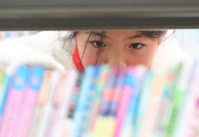 一个孩子在阜南县图书馆段郢乡分馆里挑选借阅图书