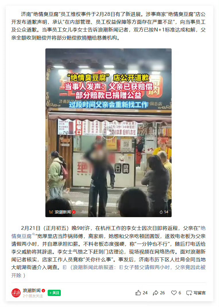 绝情臭豆腐店发布道歉声明不愧是绝情臭豆腐店,够绝情啊。七年多员工,请个假,直接给开了。最后获赔N+1。(其实没必要捐,应得的)