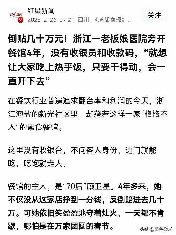 活菩萨转世,浙江一老板娘在医院旁开餐馆四年,不问顾客身份,吃完就走,不收费。 说的就是浙江海盐那位70后大姐顾卫星,这家开在医院旁的素食馆,没有收银台,没有收款码,甚至连问一句“你是谁”“来干嘛”的人都没有。每天到了饭点,店里就坐满了人,大多是刚从医院出来的患者家属,还有周边扫地的环卫工人、独居的老人,谁来了都能坐下,盛一碗热饭,夹几样素菜,吃饱了抹抹嘴就能走,不用掏一分钱。 没人知道,顾大姐开这家店,背后藏着一段让人揪心的经历。早几年,她丈夫因病住院,她在医院陪床的那些日子,见多了病患家属的难处——把所有钱都花在治病上,舍不得买一口热饭,常常蹲在医院门口啃冷馒头、喝凉水。那时候她就琢磨,要是能有个地方,让这些人不用花钱,就能吃上一口热乎饭,该多好。后来丈夫走了,这份念头变成了行动,她拿出自己所有积蓄,花了十几万装修店面,把餐馆开在了医院旁边,一守就是四年。 这四年,说起来容易,做起来难到骨子里。顾大姐每天天不亮就去市场挑新鲜食材,回来洗菜、切菜、炒菜,一个人扛下了店里所有活,常常忙到深夜,累得直不起腰。饭菜都是家常素菜,没有山珍海味,却每一口都做得用心,就是为了让那些疲惫的人,能吃口舒服的。 最让人动容的是,这家店从开业第一天起,就一直在亏本。水电费、食材钱、房租,每一笔开销都要顾大姐自己贴补,最多的时候,一个月就要倒贴近万元,四年下来,她前前后后赔进去几十万。哪怕是万家团圆的春节,整条街的餐馆都关门歇业,她的店也依旧敞开着,只少备点分量,却从不停火——她知道,春节期间,还有很多人在医院陪床,没地方吃热饭。 顾大姐的善举,慢慢打动了身边的人。有爱心人士主动包揽了餐馆的房租,隔壁超市的老板常年免费给她送新鲜蔬菜,还有一位来自湖南的大姐,主动来店里做义工,帮她洗菜、洗碗,成了她的左膀右臂。四年时间,这家小小的餐馆,已经接待了超过10万人次,一碗碗热饭,暖了无数人的胃,也暖了无数人的心。 不过话说回来,我也想多说两句实在的。顾大姐的善举,确实配得上“活菩萨”这三个字,但我也发现,有些时候,善意反而会被有些人当成理所当然。就像我听说过别的地方,有老板免费给病患家属供饭,结果自己有事关门三天,就被人质问“你怎么能说停就停”,甚至有人吃完饭后,还顺手带走店里的调料、一次性筷子,觉得反正不花钱,拿点也无所谓。 这其实挺让人寒心的,顾大姐开餐馆不是义务,她掏出自己的积蓄,付出自己的时间,图的不是回报,只是想帮一把那些难处的人。我们可以不回报,但至少要懂得珍惜,不能把别人的善良,当成自己占便宜的资本。 还有一点,顾大姐的餐馆能坚持四年,离不开身边人的帮助,可这样的善意,终究是个人的力量,太单薄了。医院旁的就餐难题,从来都不是一个人能解决的,那些陪床的家属、忙碌的环卫工人,他们需要的,不只是一家免费餐馆,更需要更多人、更多力量来关注。 顾大姐常说,她没想太多,就是想一直把店开下去,让这份温暖传下去。这份朴素的心愿,比任何华丽的话都动人。我们总说世态炎凉,可总有像顾大姐这样的人,用自己的微光,照亮别人的困境,让我们相信,善良从来都不会被辜负。 对于此事,各位怎么看?欢迎讨论留言