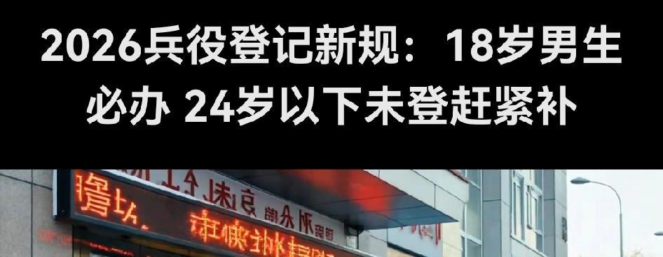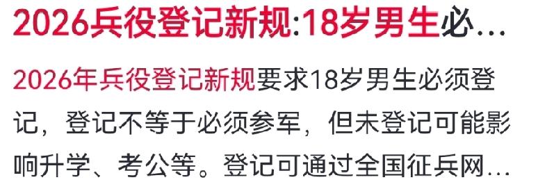 你家有18岁男孩吗?2026年这件事,千万别大意! 2026年兵役登记新规已落地执行,关系每个男生的升学就业。国防部明确:不完成兵役登记,高考报不了名,大学入不了学籍,将来考公、进国企也直接被卡! 很多家长有致命误区:以为孩子不当兵就不用登记。错!兵役登记是法定义务,不是入伍申请。线上几分钟就能完成,不会被强制当兵,也不影响未来发展。 凡是2026年年满18岁的男生,无论在校、打工还是留学,都必须登记。往年漏登的24岁内青年,今年务必补办。 现在全国联网、部门联审,没空子可钻。别因一时疏忽,耽误孩子一生。随手转发,提醒身边家长! 对此你怎么看? 兵役登记 家长必读