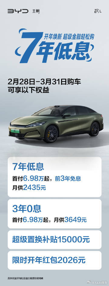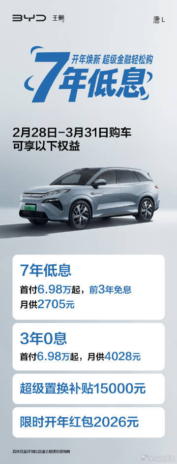 比亚迪汉L、唐L推出马年开年购车福利,提供3年0息、7年低息金融方案,首付低至5.98万元起,月供轻松,助力用户新年省心购新车。比亚迪汉L唐L