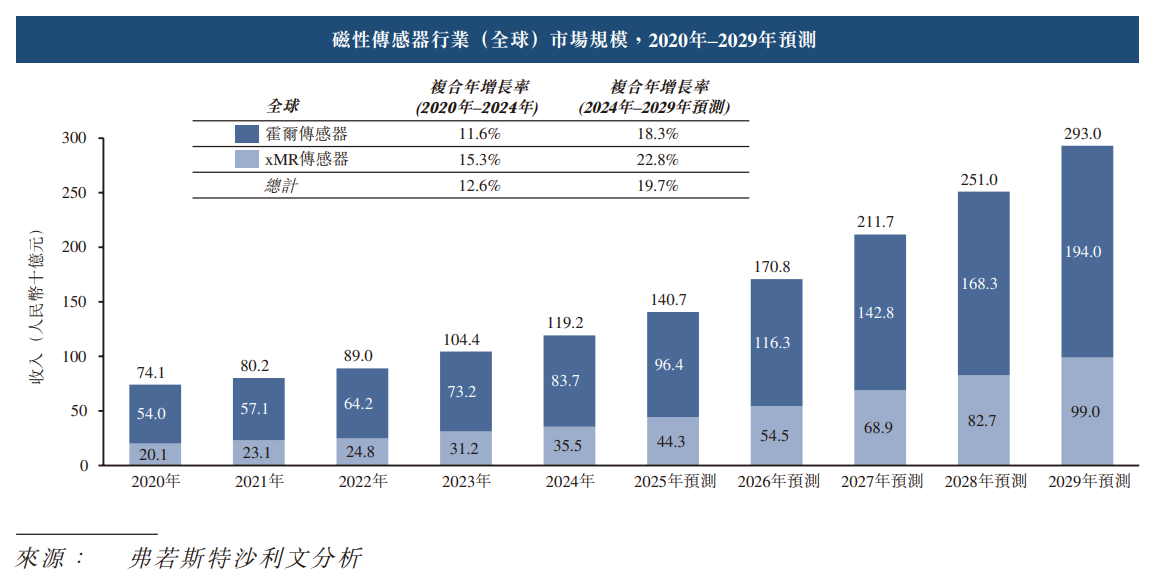 磁性传感器行业过往的增长主要依赖于汽车、工业自动化及绿色能源等下游行业的发展。在预测期内,该等下游行业需求的进一步增加推动全球磁性传感器行业的增长。此外,具身智能及第三代半导体等新兴行业的快速发展,预计将推动需求增加,并为全球磁性传感器行业创造新的增长点。