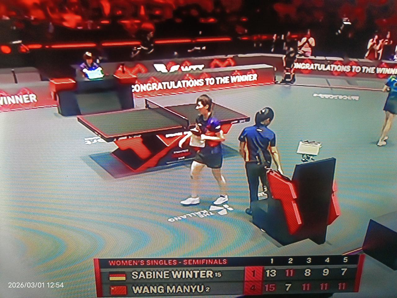 马琳教练关键时刻叫暂停支招,立马让王曼昱上场结束战斗,中国队提前包揽新加坡大满贯女子单打冠亚军。 在新加坡大满贯女子半决赛的比赛中,由王曼昱对阵德国选手萨宾.温特。温特打法怪异,此前曾淘汰了朱雨铃和王艺迪。 比赛打到第5局时,虽然大比分王曼昱3:1领先,但王曼昱打得还是很困难。此时王曼昱被温特连续追分,已追到6:7仅领先一分,如果被温特追上并反超比分,比赛可能会被拖入下一局,增加比赛的难度和风险。 在这个关键时候,场上教练马琳果断地叫了一个暂停,并给王曼昱支了一招,就是接下来的发球中发温特正手短。 果然,上场后温特虽然把比分追成了7平,但接下来王曼昱两个正手短的发球直接得分,一下子让温特没了精气神,王曼昱又连得两分结束了战斗,以大比分4:1战胜了温特进入了决赛。 由于另一场半决赛将在中国选手孙颖莎和陈熠之间进行,所以王曼昱的胜利,也使中国队提前包揽了新加大满贯女子单打的冠亚军。