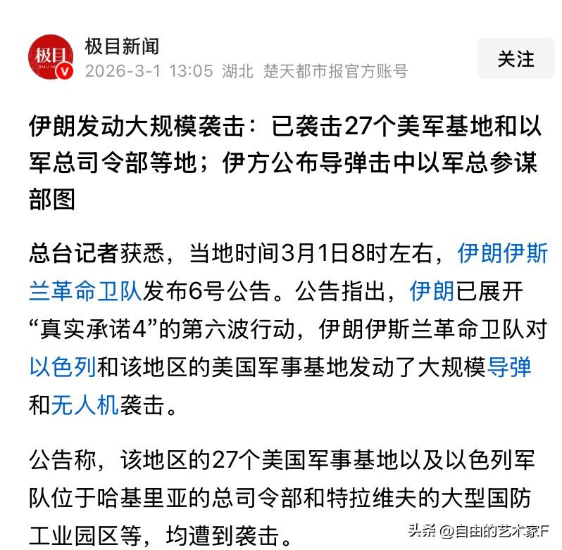以军总部被炸的现场图来了!火光冲天 伊朗和美国以及以色列的冲突已经来到了第二天,以色列国防部发言人称,从夜间到凌晨袭击了伊朗西部和中部的30个目标,伊朗的防空系统和导弹发射器遭到了进一步的摧毁。 同一时刻,伊朗方面发布了第6号公告,称他们对美以的攻击来到了第六轮,27个美军基地遭受到了致命打击,以色列军队位于哈基里亚的总司令部,以及特拉维夫的大型国防工业园区均遭到不同程度的袭击。 同时伊朗还公布了,以军总参谋部被袭击的现场图,在图片中我们看到中现场燃起了熊熊大火,视频中还能听到人们的惊呼,不断地由无人机正在飞往以色列的高价值目标 除此之外,现在的德黑兰恩格拉布广场聚集了上万民众,愤怒的民众举着哈梅内伊的照片痛哭。伊朗现在民族情绪高涨。这也意味着在未来的一段时间,伊朗和美国和以色列没有办法和平的解决这件事情,这种情况对中东的局势来说,就如同暴风雨的前夜一样危险,火药桶即将被点燃。