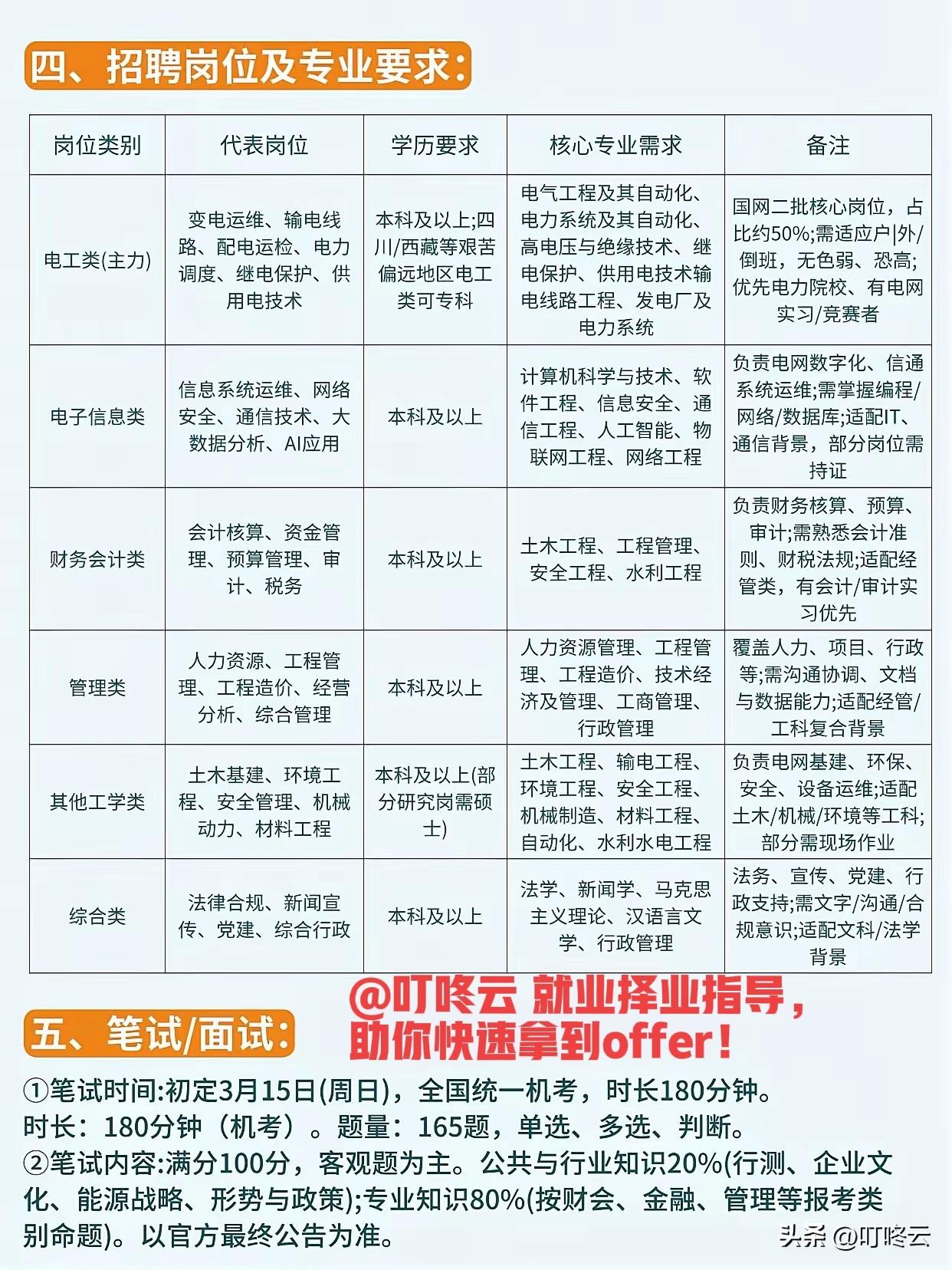 尔等宝剑锋利否?来试试!国家电网26年二批春招岗位要求及求职攻略:电力赛道的“上岸快车道”⚡速速收藏!@叮咚云 帮你解读重点和职业指导:2026年国网二批春招已吹响集结号,网申窗口锁定2月25日-3月4日,笔试定档3月15日。从历年录用数据看,二批竞争烈度远低于一批,部分岗位报录比低至1:10,堪称“捡漏黄金期”。🔥🔥 今年招聘对象覆盖26届全日制应届生,电工类专科可报,其他专业本科起步,年龄限制清晰明了。岗位矩阵堪称“万物皆可国网”:电工类作为主力,占比超50%,适配电气、电力系统等硬核专业;电子信息类、财务会计类、管理类等赛道全面开放,连法学、新闻、土木都能找到专属工位,真正实现“专业不设限,电力有可为”。[燃烧的心][燃烧的心] 薪资待遇更是诚意拉满:一线城市硕士16-20万/年,二三线城市本科12-15万/年,县局基层8-12万/年,高级人才更是40-200万/年+安家费,六险二金、各类补贴加持,妥妥的“电力金饭碗”配置。[招财进宝][招财进宝] “长风破浪会有时,直挂云帆济沧海”,别等春招落幕才追悔莫及。现在就锁定目标岗位,打磨网申简历,刷透165道客观题真题,把“电力赛道”变成“上岸快车道”。[福][福] 欢迎关注@叮咚云 将优先为粉丝职业规划指导,为你定制最适合的就业择业方案!欢迎留言交流讨论。[来看我][来看我] 免责声明:图片来自网络,仅供参考 央国企招聘国家电网求职 国网二批报名 电网招考