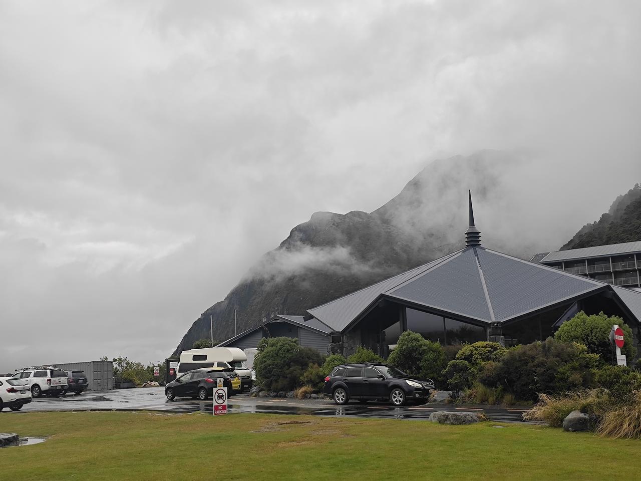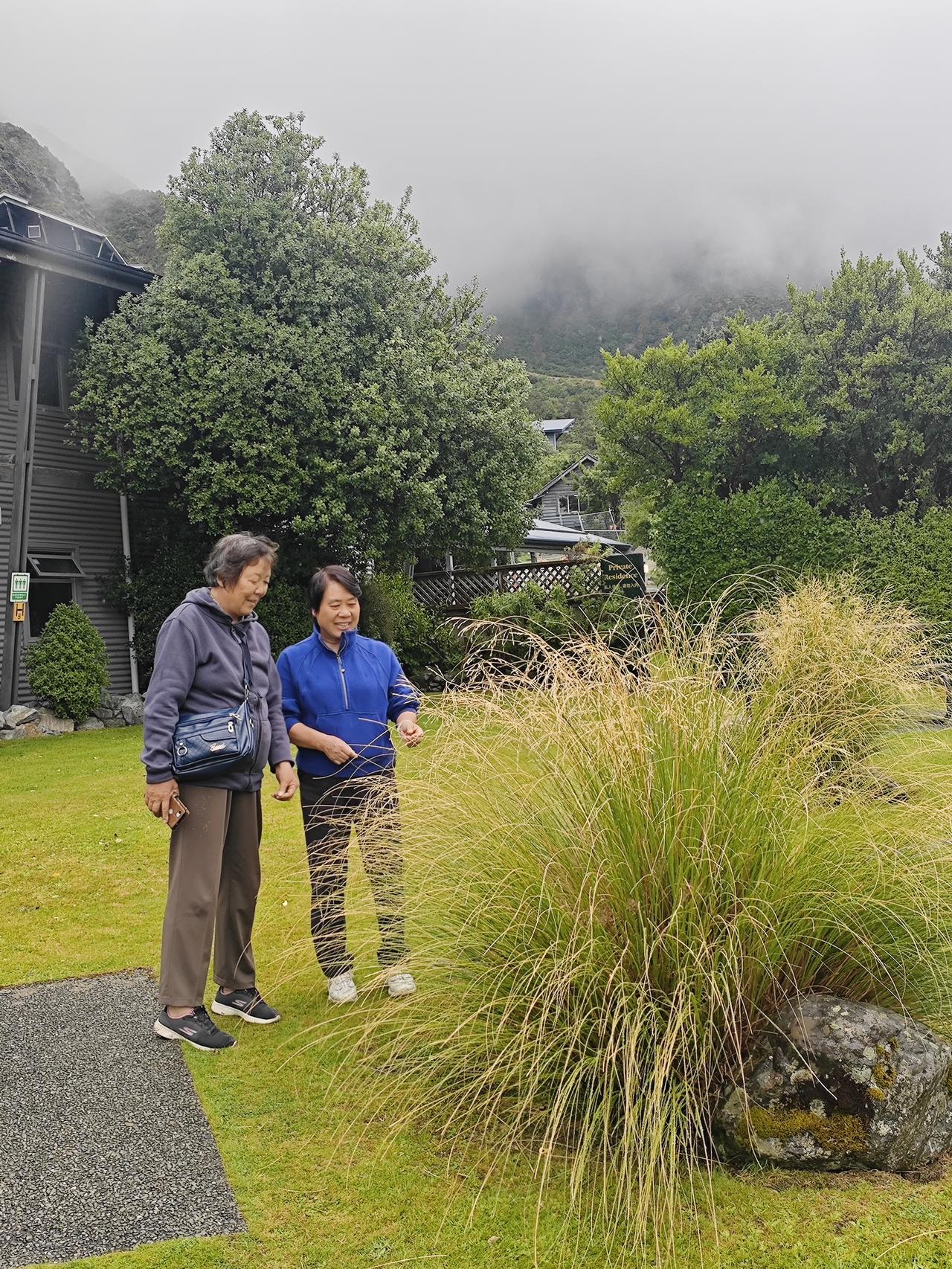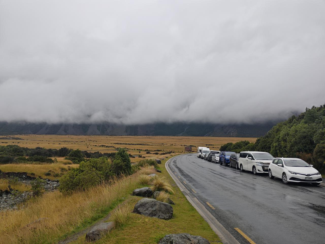 库克山下 库克山位于南岛南阿尔卑斯山脉,是库克山国家公园的核心,毛利人起名为Aoraki(意为穿云者),欧洲人以库克船长的名字命名,现在属于联合国教科文组织世界遗产地。 我们的午餐就安排在库克山下的酒店里,马导介绍说这里是几百公里唯一的一个旅游酒店,价格特别高,独门生意,谁也没办法。 下雨淅沥沥地下个不停,远处的山脉看不清楚,近处库克山下,倒是云雾缭绕,在这黄草地的映衬下,别有一番风味哈! 库克山下有一处非常理想的徒步路线,可惜因为雨天,我们只走了很短的一点,便匆匆返回。 库克山地区海拔稍高一些,加之慢慢进入新西兰的秋季,草地也在变黄,鲁冰花的季节已过去,所幸的是我们在黄色草地上还看到几枝最后的鲁冰花。 离开库克山下的酒店,时间不长就是著名的蓝色牛奶湖——普卡基湖了。普卡基湖是这里最大冰川堰塞湖,其蓝色成因源于极细的冰川岩粉,阳光散射后呈现出梦幻的牛奶蓝…… 心目中的蓝色牛奶湖景色,在这样的雨天彻底没戏了。看来我们只能在网上找找蓝色牛奶湖的照片,慰藉一下渴望了许久的心情……