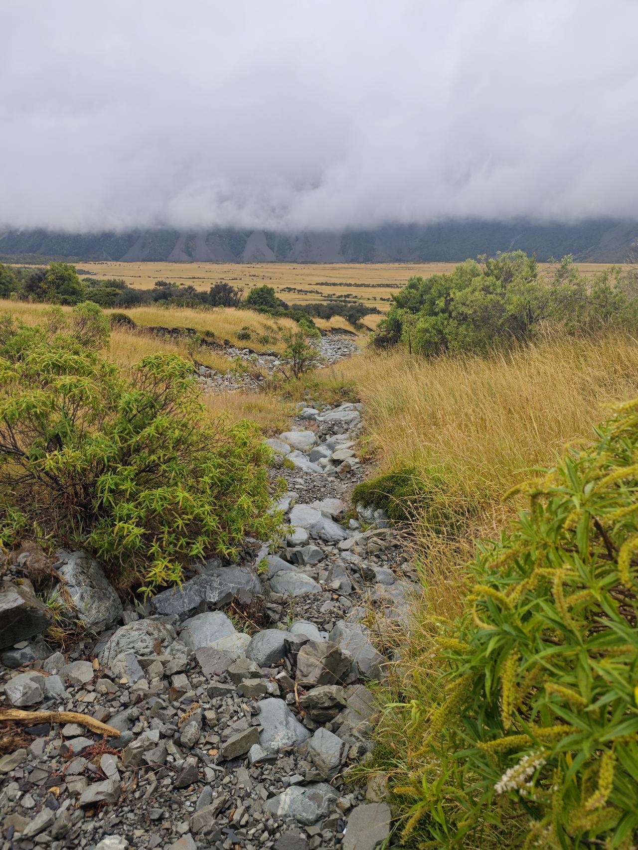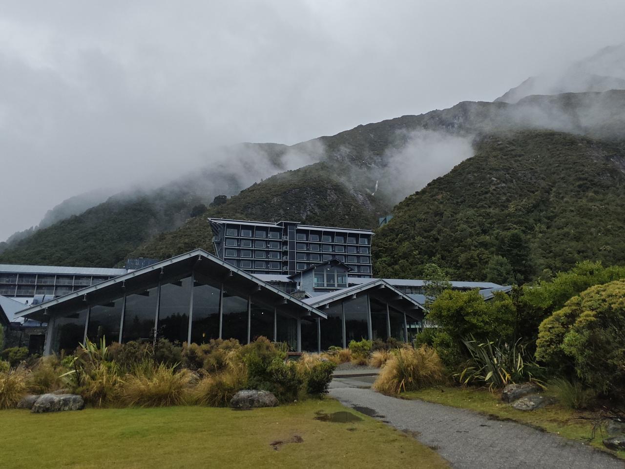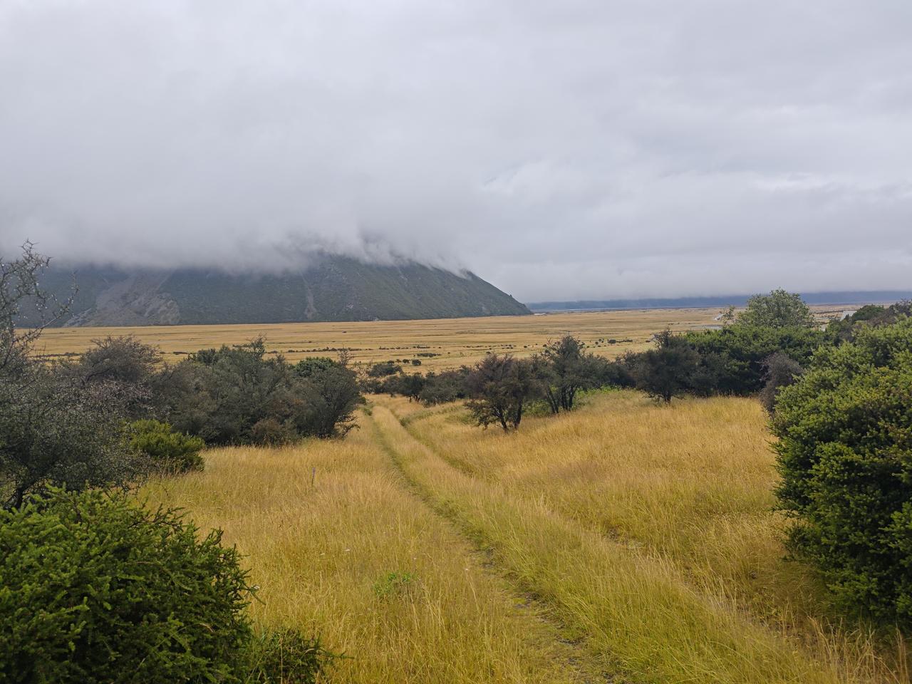 库克山下 库克山位于南岛南阿尔卑斯山脉,是库克山国家公园的核心,毛利人起名为Aoraki(意为穿云者),欧洲人以库克船长的名字命名,现在属于联合国教科文组织世界遗产地。 我们的午餐就安排在库克山下的酒店里,马导介绍说这里是几百公里唯一的一个旅游酒店,价格特别高,独门生意,谁也没办法。 下雨淅沥沥地下个不停,远处的山脉看不清楚,近处库克山下,倒是云雾缭绕,在这黄草地的映衬下,别有一番风味哈! 库克山下有一处非常理想的徒步路线,可惜因为雨天,我们只走了很短的一点,便匆匆返回。 库克山地区海拔稍高一些,加之慢慢进入新西兰的秋季,草地也在变黄,鲁冰花的季节已过去,所幸的是我们在黄色草地上还看到几枝最后的鲁冰花。 离开库克山下的酒店,时间不长就是著名的蓝色牛奶湖——普卡基湖了。普卡基湖是这里最大冰川堰塞湖,其蓝色成因源于极细的冰川岩粉,阳光散射后呈现出梦幻的牛奶蓝…… 心目中的蓝色牛奶湖景色,在这样的雨天彻底没戏了。看来我们只能在网上找找蓝色牛奶湖的照片,慰藉一下渴望了许久的心情……