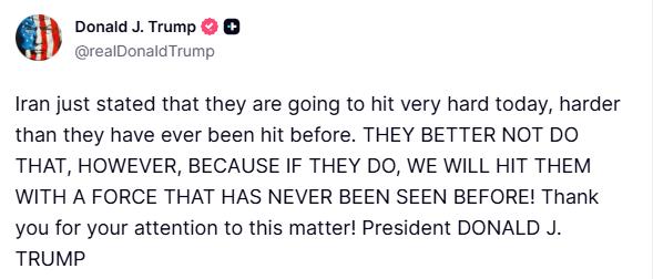 特朗普又发帖称:“伊朗刚刚声明,他们今天将发动猛烈反击,比以往任何一次都更加猛烈。不过,他们最好别这么做,否则我们将以前所未有的力量打击他们!”